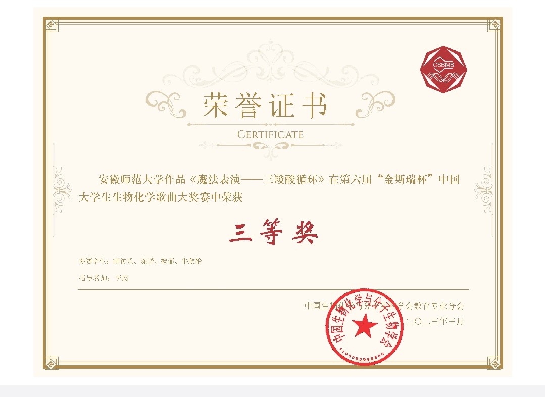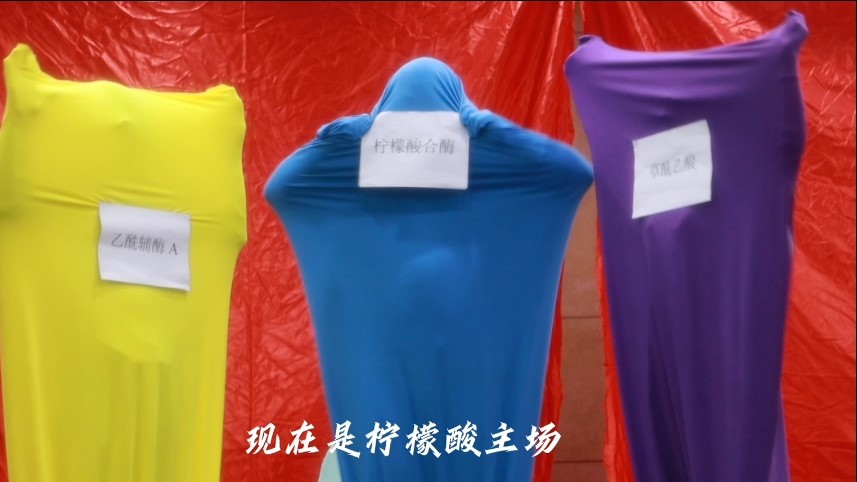 2021级生物科学专业卓越教师班胡传乐、檀菲、陈诺、牛饮怡作为参赛队伍的主力队员参加此次比赛。在比赛的前期准备中,公司参赛队伍经过与指导老师李恩老师多次进行沟通和磨合,最终选择以音乐剧和马戏表演的形式,将三羧酸循环的各个物质呈现出来,最终取得比赛三等奖的好成绩。