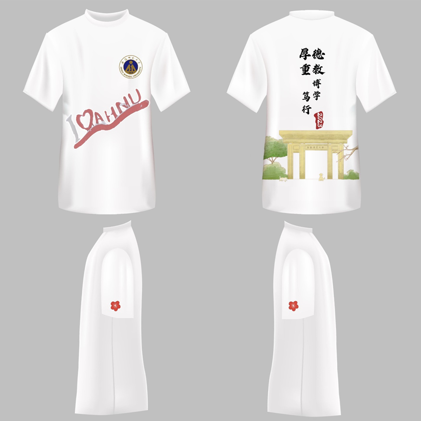 文化衫正面由m88官方网站登录地址校徽和“I❤AHNU”的红色艺术字组成;背面是师大校训和赭山校区大门图案以及专属年份“2023”;袖口两侧以小红花做装饰;整体贴近师大校园特色,突显校园文化,符合员工气质和时代主题,充分展现出了公司学子朝气蓬勃、健康向上的良好精神风貌。