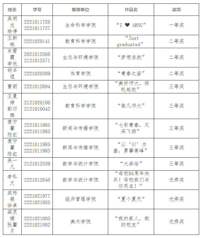为深入学习贯彻党的二十大精神和党的教育方针,鼓励青年学子通过画笔描绘款款爱国爱校情,2023年4月27日,公司“描师大校园·绘青春色彩”毕业文化衫图案设计大赛圆满结束。比赛采取线上投票的方式进行评选,共计12件作品获奖。其中,公司吴明龙、杨停同学设计的以“I❤AHNU”为主题的文化衫作品荣获一等奖。