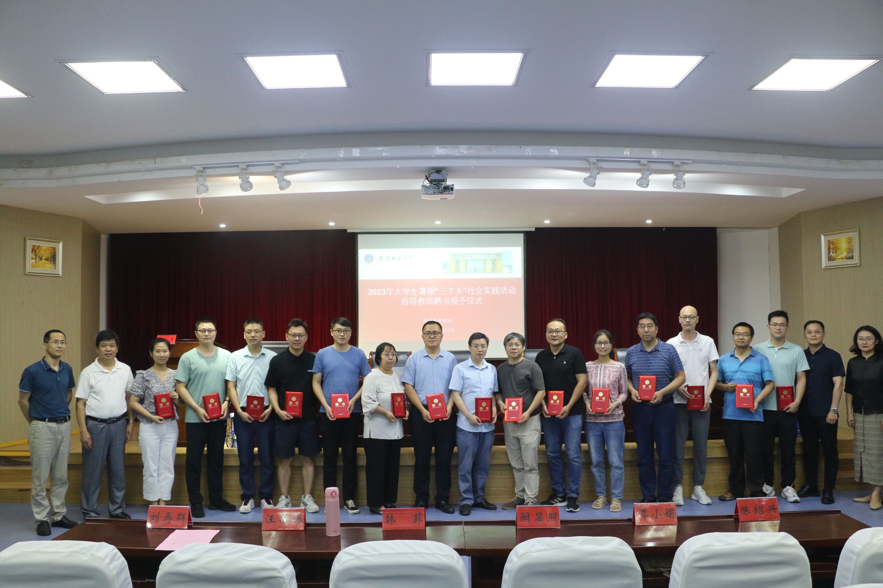 仪式以庄严的国歌声拉开序幕。汪倩倩宣读了《生命科学学院关于2023年老员工暑期“三下乡”社会实践活动的安排意见》。陈冬生宣读了《m88官网2023年老员工暑期“三下乡”社会实践团队名单》,与会领导为全体指导老师发放了聘书。