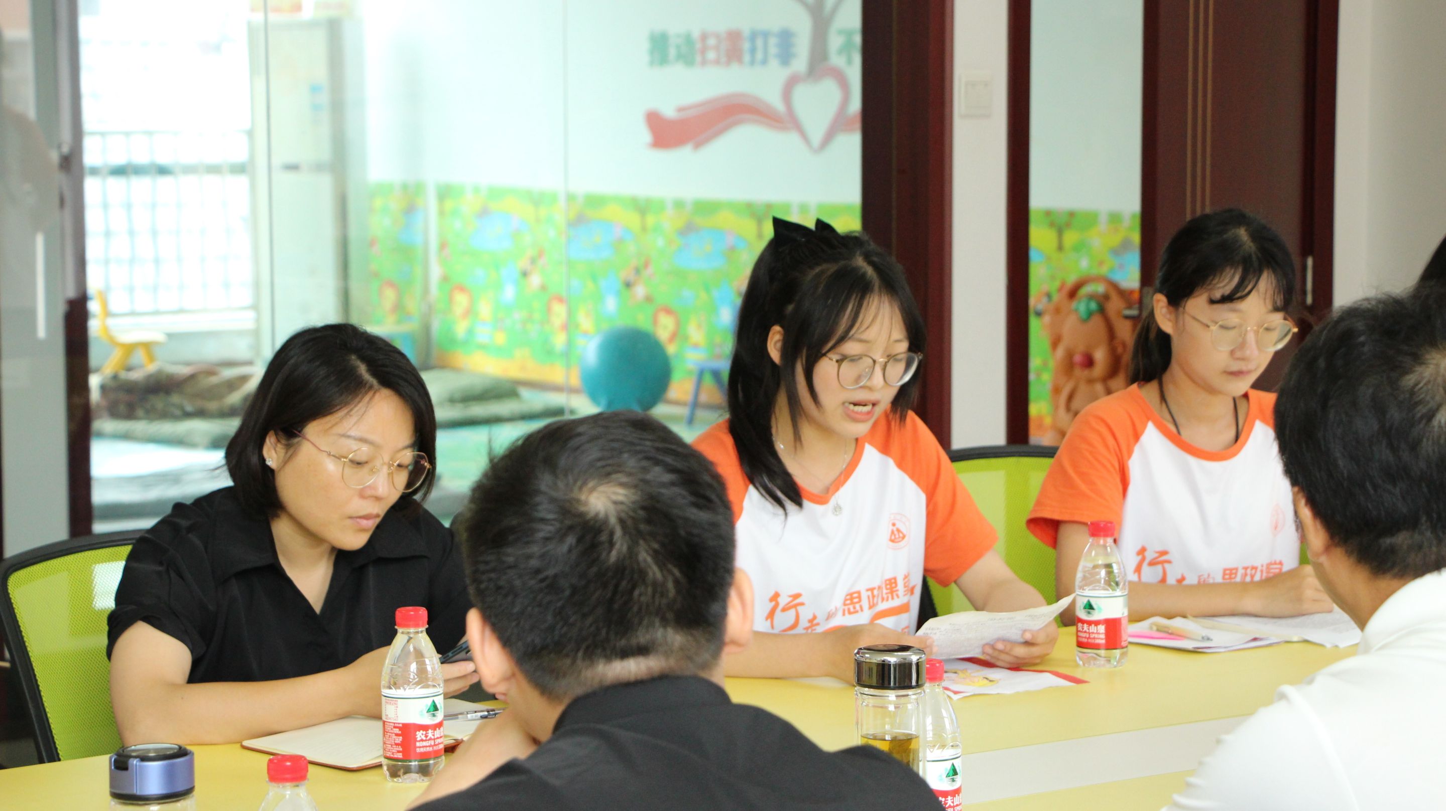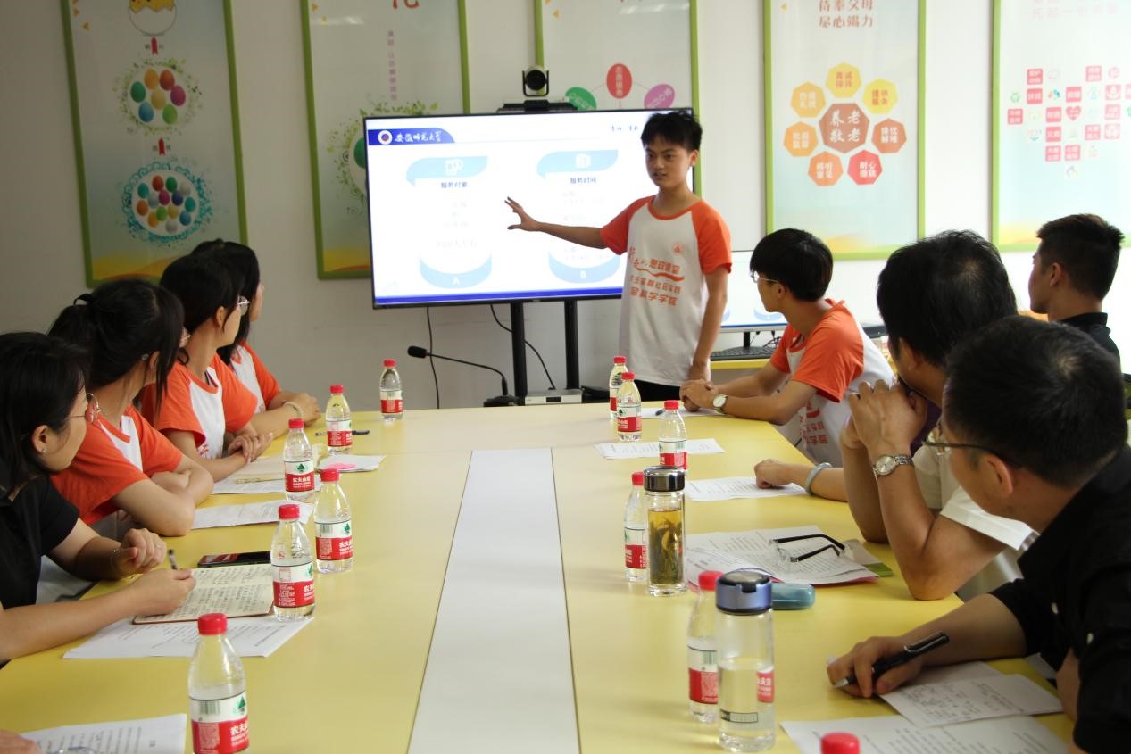 志愿团队队长周立汇报展示团队工作流程以及目前工作成效。团队成员、社区领导以及生科院领导齐坐一堂,共同探讨活动安排并分享自己的感悟。清苑社区组织联合会会长孙兆寿老师说到:“感谢安师大生科院各位领导对该社会实践活动的高度重视,希望我们可以长期合作,推动社区和公司的双向良性互动”。志愿团队的两名队员代表分别分享了自己的实践感悟,胡功云同学从“如何提高自己的师范生技能,成为一名更好的老师”谈起,她认为好老师一定要尊重孩子们的奇思妙想并深入了解他们的内心以达到教学相长的目的。曹梦媛同学从社区、孩子、公司以及个人这四个角度总结并生发感悟,她微笑着说:“看见孩子们的笑容,便也没那么辛苦了。”