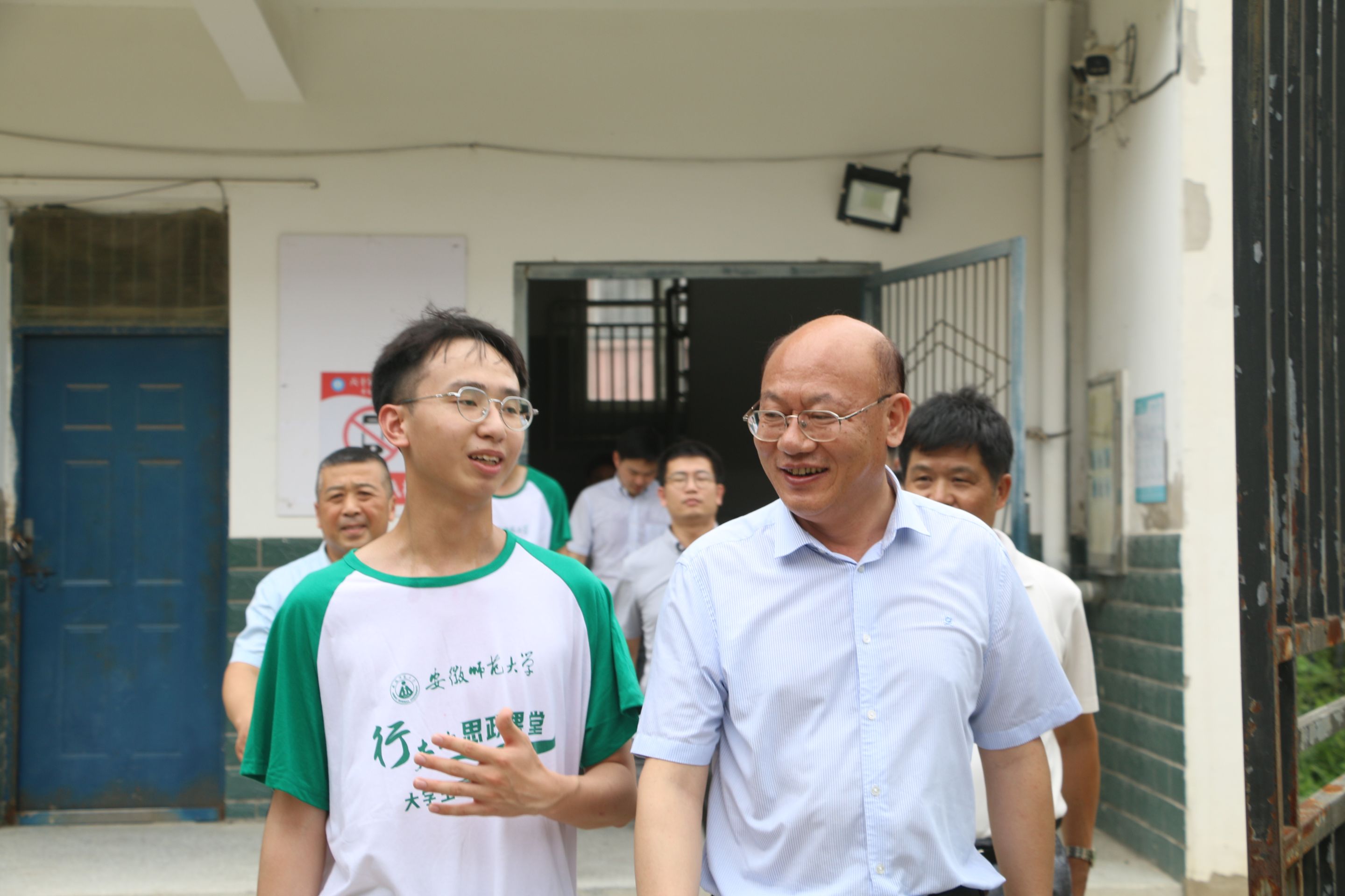本网讯(生科院 潘诚)7月7日上午,校党委常委、校纪委书记、监察专员周新发,公司党委书记蒋学波,校团委副书记陈骁,马克思主义公司副教授张鑫,生科公司党委副书记汪倩倩一行赶赴阜阳市颍上县六十铺镇中心公司,对安徽师范老员工命科学公司赴阜阳颍上“红烛行动”爱心支教实践团队进行慰问。颍上县副县长岳岿、颍上县教育局局长许宗峰热情接待并安排六十铺镇党委书记杨平、颍上县教育局教研室主任郝家峰陪同慰问。