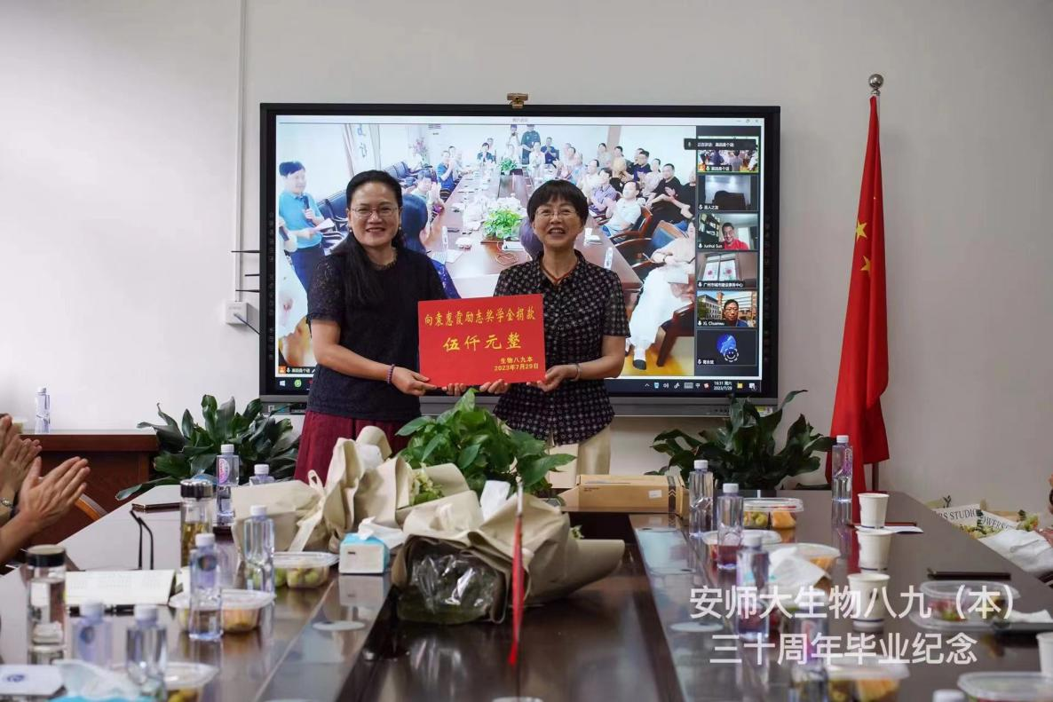 下午,同学们欢聚在生化楼二楼会议室,与公司领导、老师们一起共话师生情,共叙同窗谊。m88官方网站登录地址员工办宋波处长、生科公司党委书记蒋学波、经理朱国萍、副书记汪倩倩、专业课老师潘继红、张仁健、刘必融受邀出席座谈会。朱国萍经理热情洋溢的介绍了母院近年来的发展变化和成就,员工办宋波处长向所有关心和支持母校建设和发展的员工表示感谢,希望各位员工继续关注支持母校事业的发展。面对母校的90多年变迁,同学们感慨万千,为母校的发展深感骄傲和欣慰,为自己是母校的员工深感光荣和自豪。党委书记蒋学波是当年生物系89级本科班辅导员,他重拾点名册,逐一点到,被点到名的同学大声回应,那一刻仿佛时光倒流,重现三十多年前入学第一堂班会的情景。蔡亚非与梁蕾两位同学代表筹备组向参加聚会的同学、领导、老师致以深切的问候,郑进及班长孙俊辉同学分别代表国内外同学追忆了大学时的生活、学习趣事,介绍了各位同学毕业以后取得的优异成绩,深切表达了母校之情、老师之情、同学之情,蔡静同学代表生物八九(本)级的员工向生科院袁慧霞励志奖学金捐助了5000元。同学们追忆青春岁月、感恩母校培养、畅谈人生感悟、感怀同学深情,场面十分热烈感人。