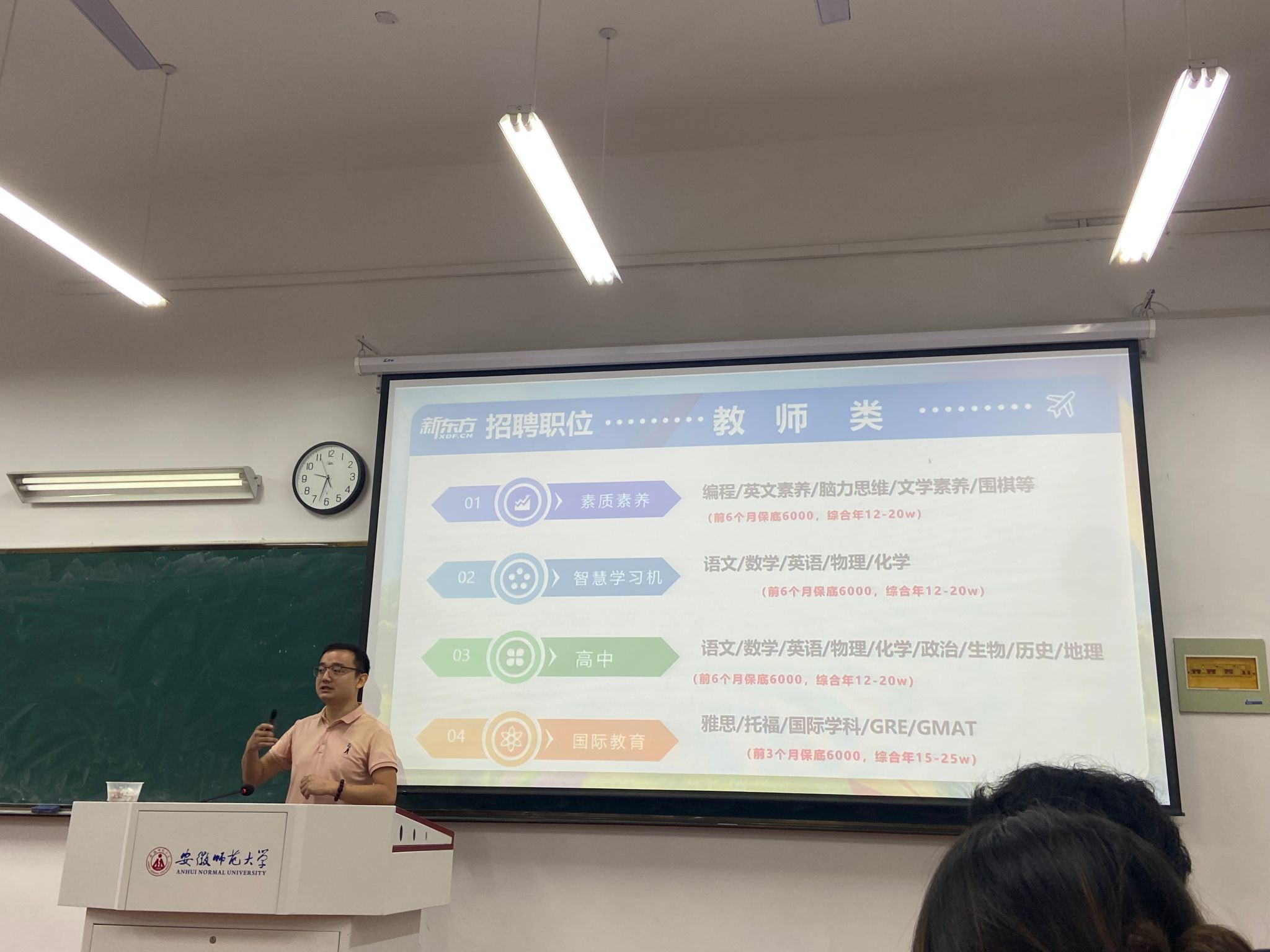 新东方教育科技集团合肥公司的招聘负责人积极宣讲,向同学们全面描述了该校的企业文化建设、薪资待遇、企业发展前景等方面的情况。应聘同学针对薪资待遇、未来个人发展前景等问题与招聘单位负责人进行深入沟通和交流。