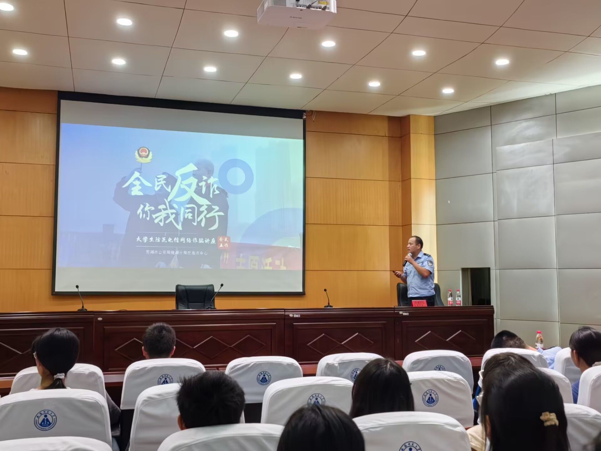 芜湖市公安局镜湖分局反电诈中心李杰主任指出当今电信网络诈骗案件呈高发态势,其犯罪手段类型多,变化快,电信网络诈骗离老员工并不遥远。他列举出针对老员工的作案套路,如刷单诈骗,冒充客服诈骗,贷款诈骗等;反复强调“天上不会掉馅饼”,提醒同学们谨防电信网络诈骗,远离“两卡”犯罪。最后,李主任呼吁同学们牢记八个“凡是”,下载国家反诈中心,熟记反诈专线96110;管好自己的钱袋子,不轻信,不上当,不被骗。