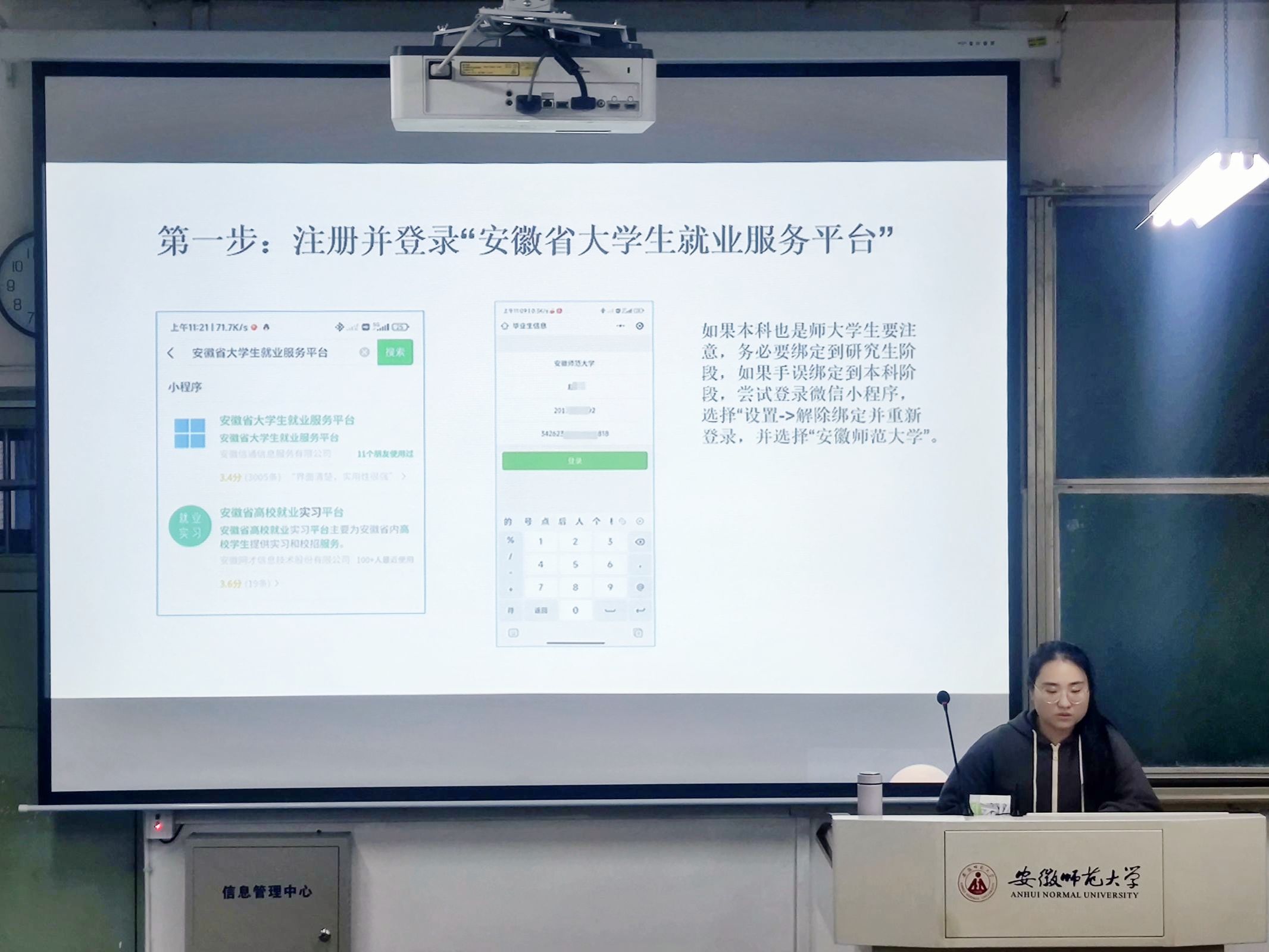 随后,研究生辅导员蒋婷婷详细介绍了安徽省高校毕业生就业网签流程,同时对2024届毕业生就业给予提醒:确认毕业资格、注意求职安全、谨防网络诈骗。