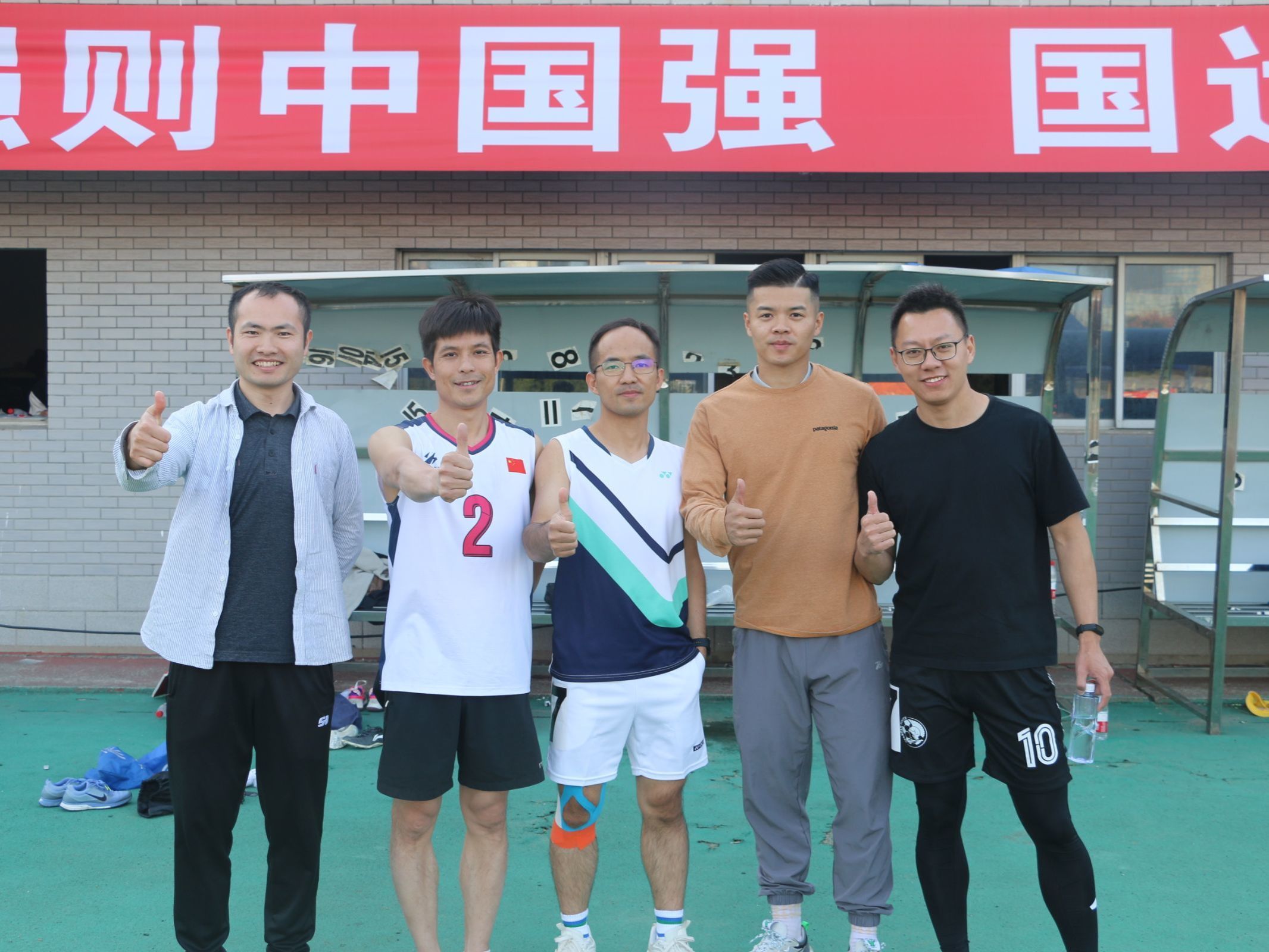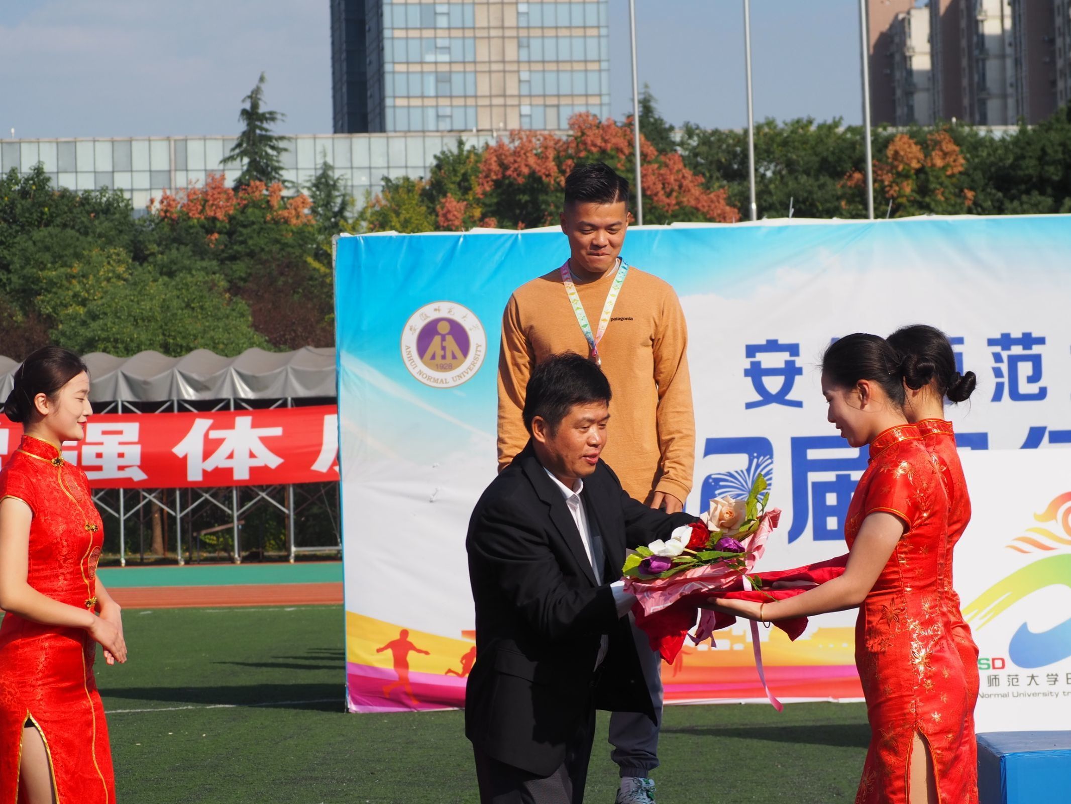 图为公司党委书记蒋学波为男子教职工跳远比赛第二名魏泽坤颁奖画面