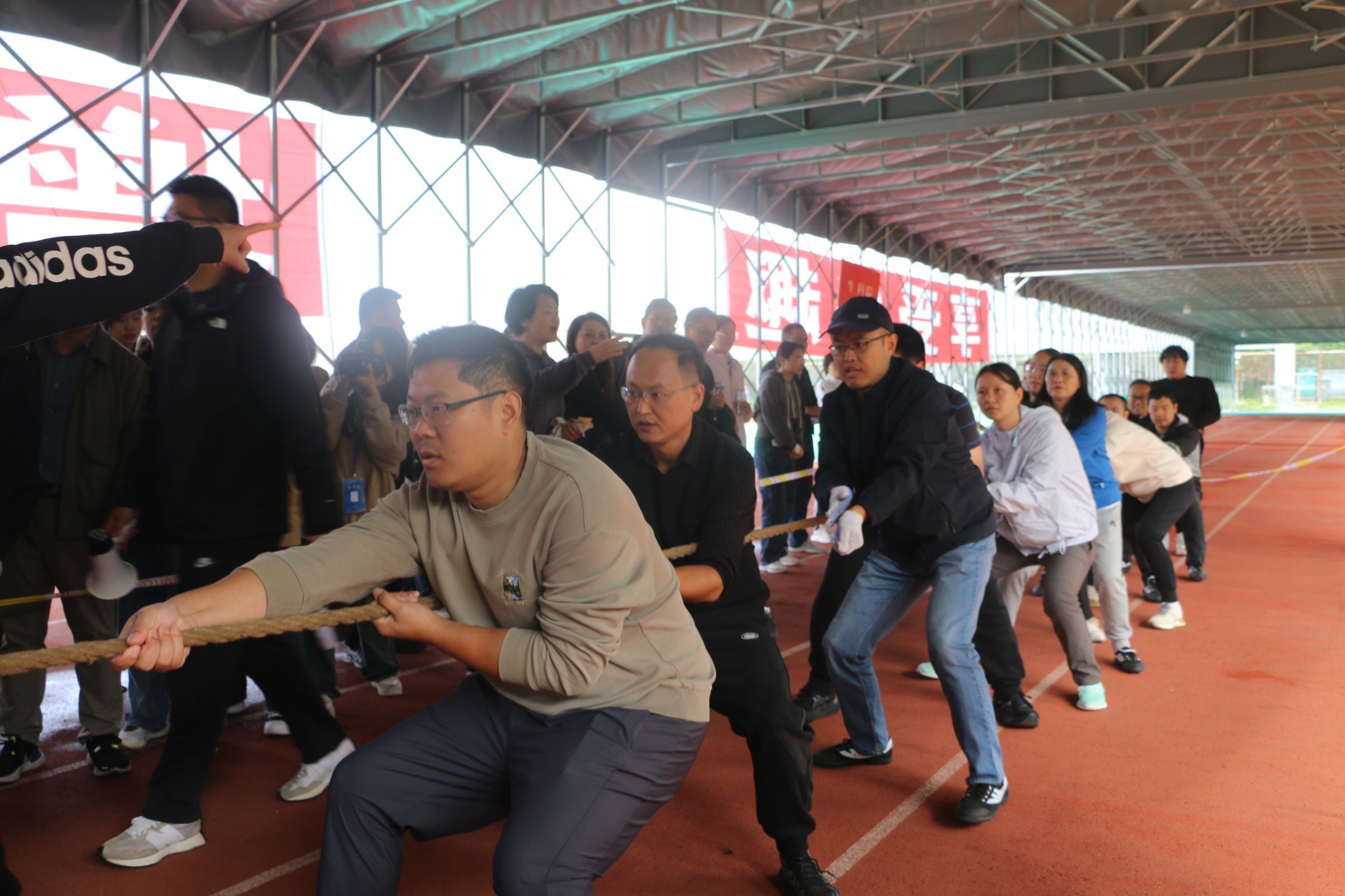 图为教职工拔河比赛:教师们紧抓绳索,全力争夺胜利