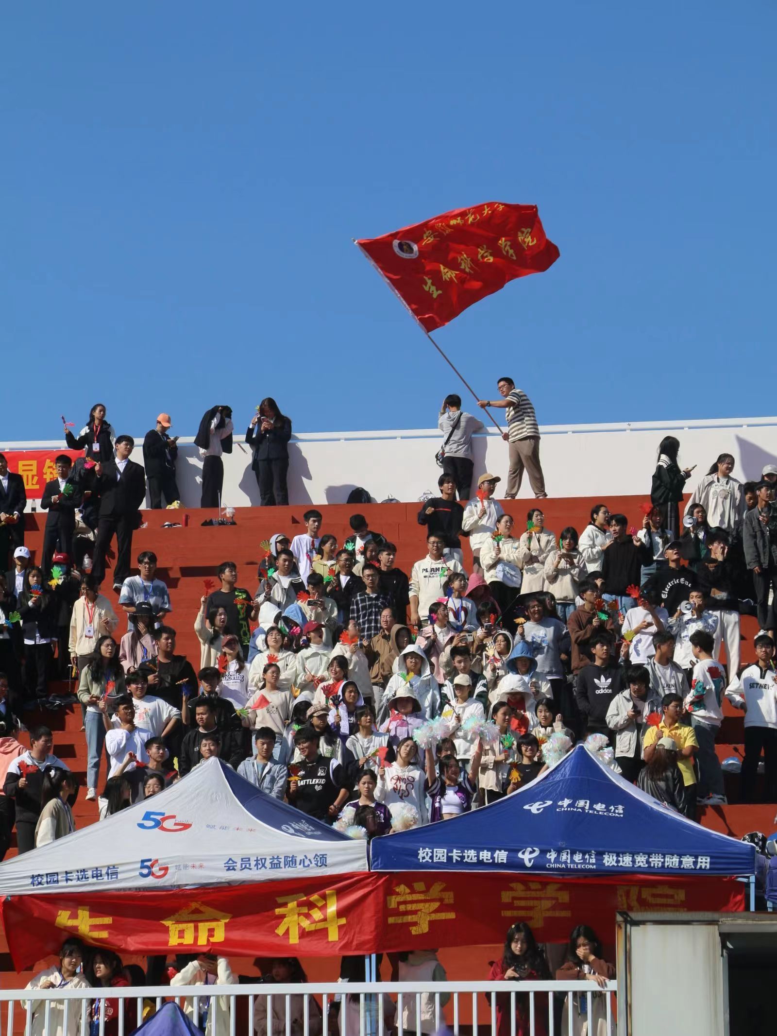 图为生科院学子在看台为运动会热烈气氛感染的情景