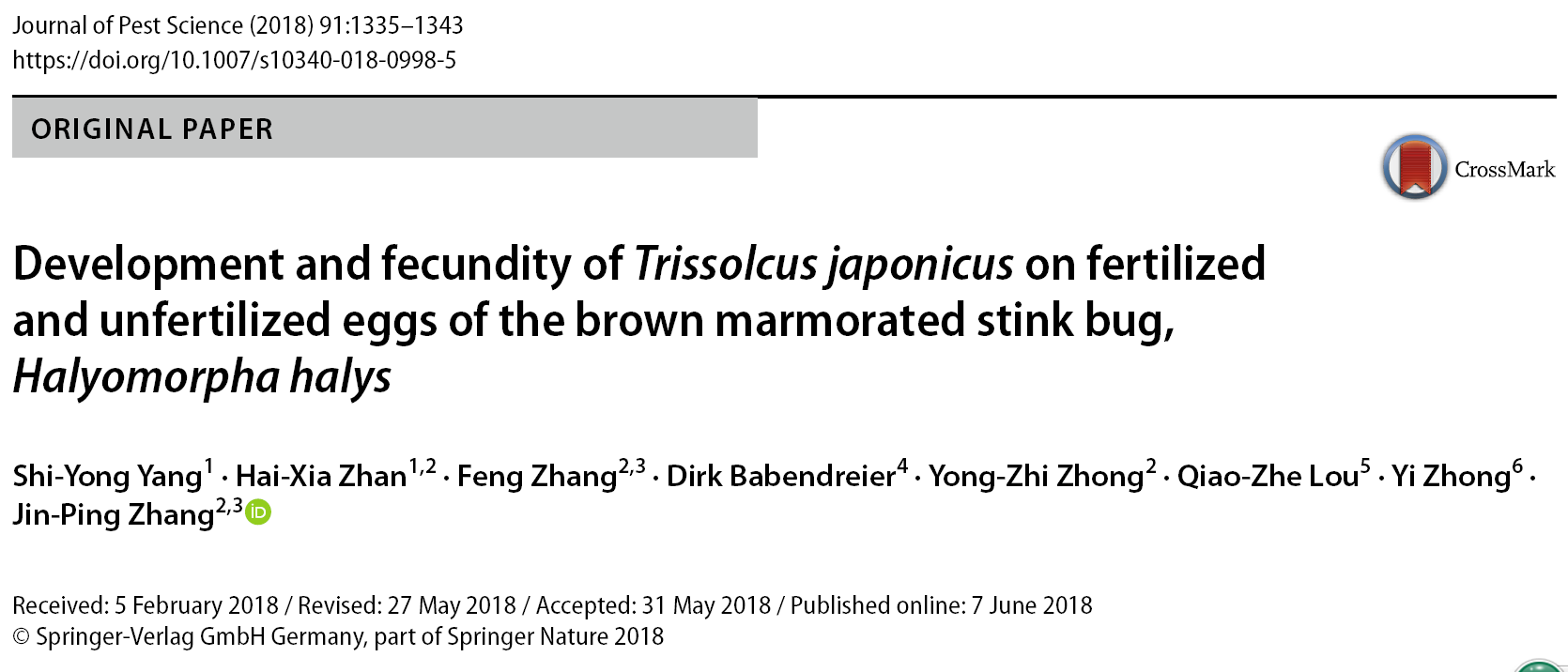 近期,公司杨世勇教授课题组在《Journal of Pest Science》(JCR昆虫学1区)期刊上发表了一篇题为“Development and fecundity of Trissolcus japonicus on fertilized and unfertilized eggs of the brown marmorated stink bug, Halyomorpha halys”的论文。该文报告了茶翅蝽的生殖生物学以及茶翅蝽沟卵蜂在受精和未受精茶翅蝽卵上的发育和繁殖力。结果表明,交配与否不影响茶翅蝽雌虫的产卵量。未交配雌虫产未受精卵,已交配雌虫产受精卵。卵的受精状态对茶翅蝽沟卵蜂子代的数量、发育、羽化和性比有影响:在受精卵上寄生的蜂卵发育延迟、出蜂数量减少、出蜂时间延迟、雌蜂比例下降。结论:可以利用茶翅蝽的未受精卵对茶翅蝽沟卵蜂进行规模养殖,田间释放以达到生物防治的目的。该文第一单位为m88官方网站登录地址,获得生物资源利用和保护安徽省省级重点实验室开放基金的资助。