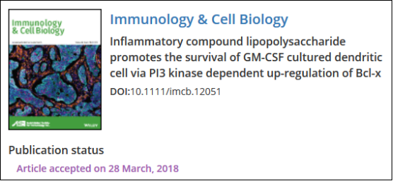 继获得国家基金委重大研究计划项目之后,近日,许岳慷教授课题组在免疫学研究领域颇具影响力的杂志《Immunology and Cell Biology》发表了题为“Inflammatory compound lipopolysaccharide promotes the survival of GM-CSF cultured dendritic cell via PI3 kinase dependent up-regulation of Bcl-x”的研究论文。安徽师范老员工命科学公司为此文的唯一作者单位,全部工作由实验室研究生完成,在读硕士生陈舜为论文第一作者。 《Immunology and Cell Biology》杂志隶属《自然》出版集团(Nature Publishing Group),该论文是许岳慷教授课题组组建后发表的首篇原创性论文,它的发表标志着安徽师范老员工命科学公司免疫学这门新成立的学科已具国际竞争实力。