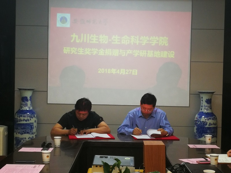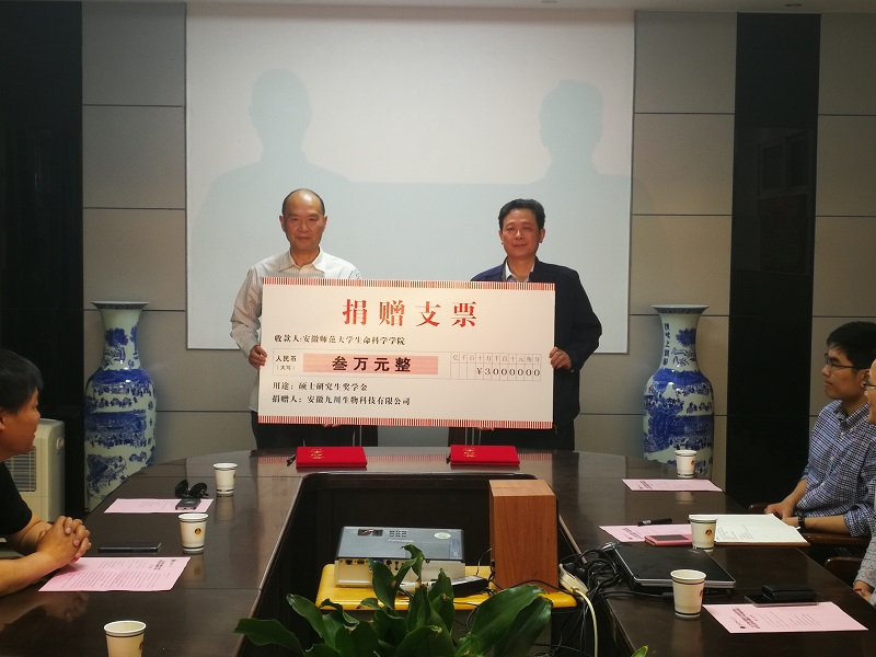 席贻龙表示,九川生物对在校研究生捐资助学是一个善举,是社会大爱的体现。他介绍,公司现有研究生规模大、人数多,尤其在生科院同时拥有2个一级学科博士点,更是公司独一无二的优势。目前在校研究生生源大多来自安徽地区,经济欠发达,虽然公司提供了较为完善的“三助”政策,但部分研究生整体收入不高。九川生物结合地域优势与生科院合作,经营领域也与生科院研究方向契合,选择对生科院捐资助学,是对教育事业、科技事业的支持和奉献。希望双方能够在未来的工作中相互关心、相互支持。