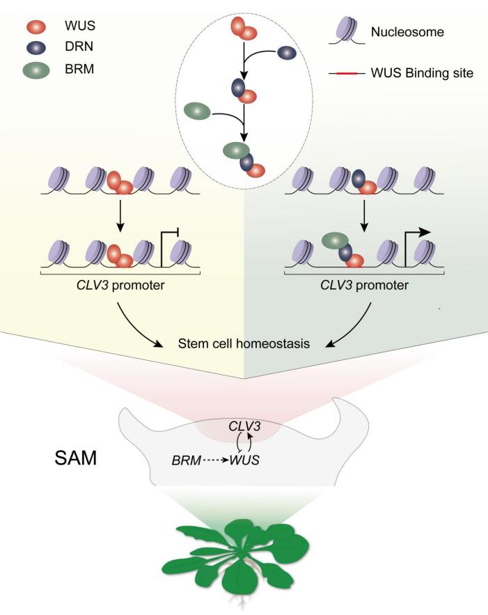 茎尖干细胞(shoot stem cell)位于茎尖分生组织(shoot apical meristem, SAM)的中央,为植物地上部分的发育提供源源不断的起始细胞。在拟南芥中,转录因子DRN在茎尖干细胞受到生长素的负调控,并激活干细胞的marker基因CLV3的转录(非直接调控),参与到CLV3/WUS的负反馈循环中来维持茎尖干细胞的稳态。但是,DRN激活CLV3表达的具体机制有待进一步解析。