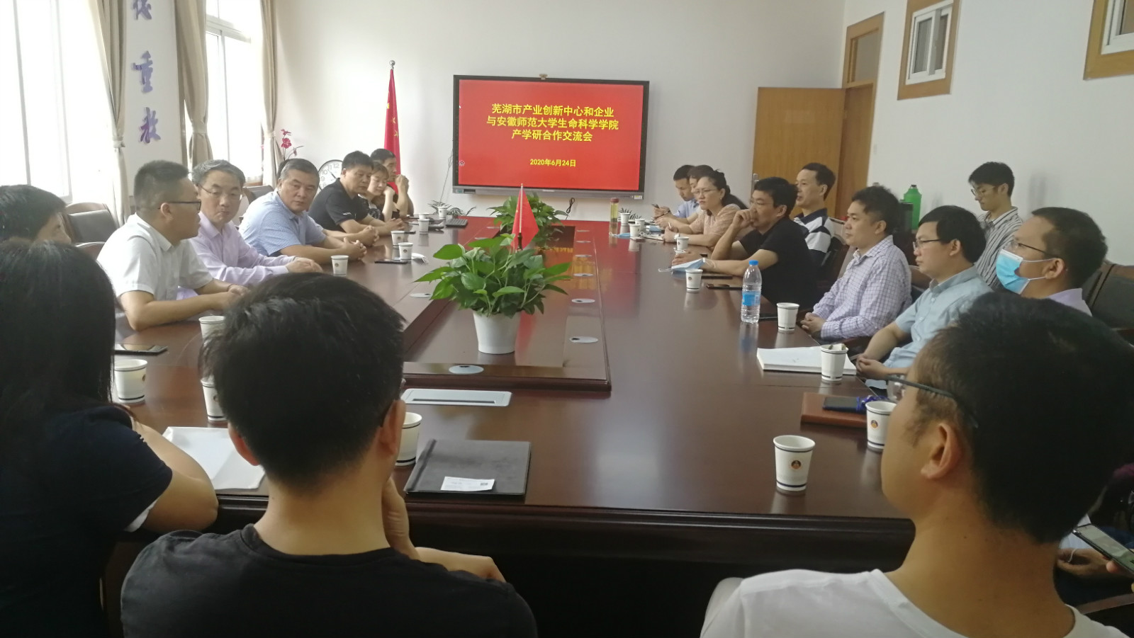 本网讯(m88官网 张文君)2020年6月24日上午,芜湖市产业创新中心携安徽九川生物科技有限公司、安徽国科生物科技有限公司、芜湖华仁科技有限公司、安徽达健医学科技有限公司、安徽未名天佳基因科技有限公司、新宇药业股份有限公司、芜湖森爱驰生物科技有限公司、芜湖耄智生物科技有限公司和芜湖青弋江种业有限公司来到m88官网,洽谈产学研合作及通过合作帮扶本科生和研究生就业事宜,公司相关专业的教师参加了交流会。