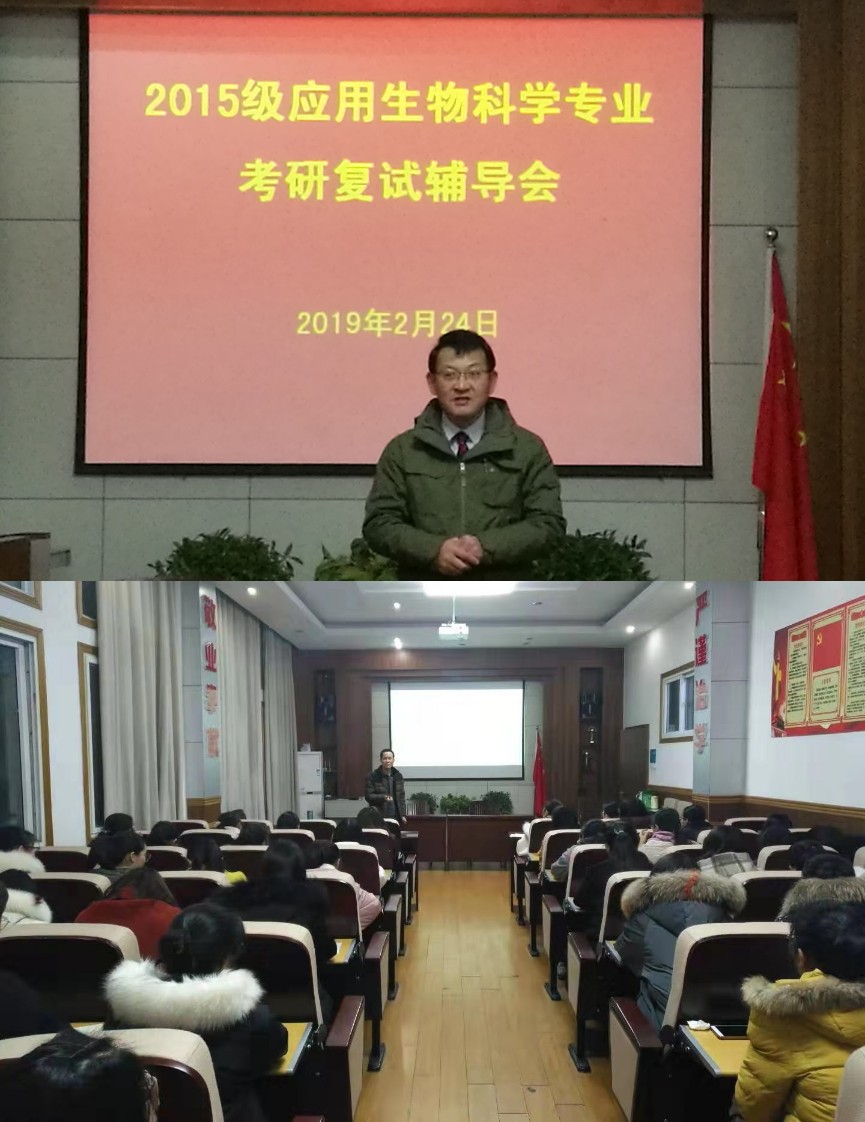 本网讯(生科院 王锐 单露晨)2019年2月24日晚上7:00,2015级应用生物科学专业开展了考研复试辅导交流会。公司党委副书记、15级应生班辅导员刘振杰老师及专业负责人陈冬生老师出席本次活动,15级应生班考研同学参加了本次辅导。