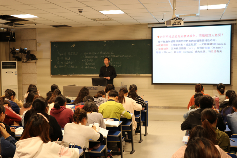 (生科院 项贤领)4月10日上午9点,本学期校本科教学示范观摩课第二讲在赭山校区田家炳楼8607录播教室举行。全国模范教师、安徽师范老员工命科学公司华田苗教授就《动物生理学》中的“视网膜的结构及感光换能系统”进行了示范教学。参加观摩课的有校院两级本科教学督导团的吴华强、汪鸣和张小平等老师,以及教务处黄亮副处长、公司蒋学波书记及部分中青年教师等20余人。