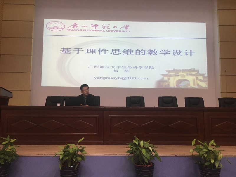 本网讯(韩菲)11月16日下午,中国教育技术协会微格教学专业委员会副理事长兼秘书长、中国教育学会生物教学专业委员会理事,广西师范大学教授杨华应邀为m88官网生物科学专业四个年级的员工做了题为《基于理性思维的教学设计》的报告,为师范生做提升教学技能的解读。公司党委副书记刘振杰、副经理胡好远、生物科学专业负责人陈明林、生物教学论教师韩菲和各年级辅导员参加了报告会。报告会由胡好远教授主持。