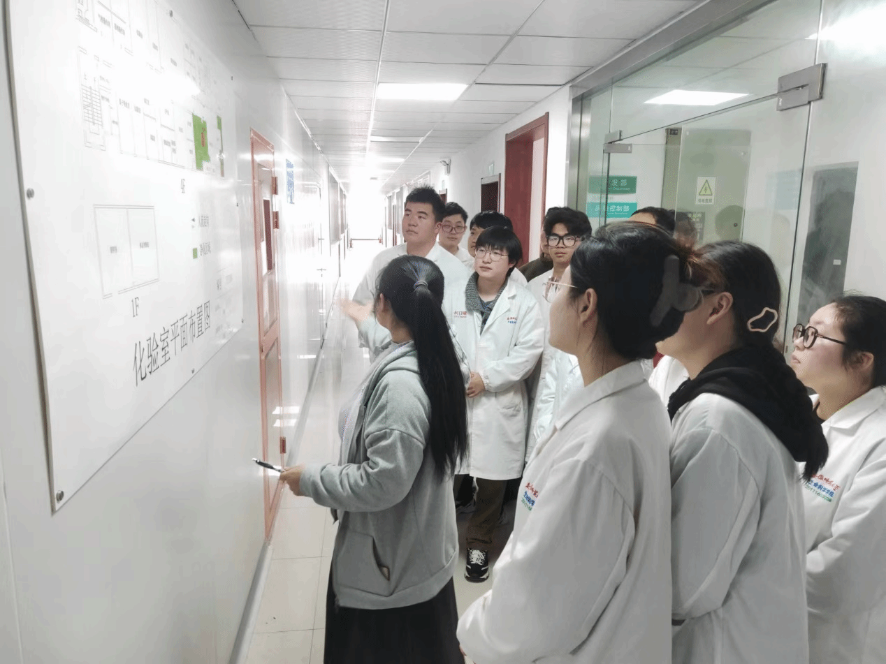 师生到达后,在企业车间主任和质控平台主管的带领下依次参观了企业的生产车间和质量控制平台。同学们认真参观了企业驱虫斑鸠菊注射液的整个生产流程,并积极与车间主任交流提问,受益匪浅。在质量控制平台,同学们了解到了企业质量把控的层层步骤,确保药品生产合格,体会到了企业生产的责任。