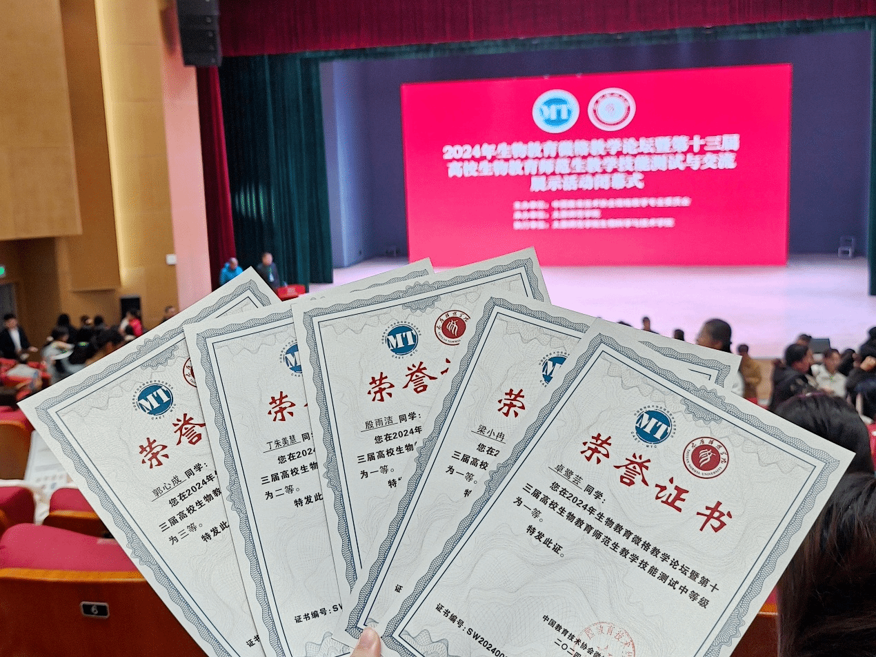 经过教学设计思路阐释、模拟授课、现场答辩等环节的激烈角逐,m88官网生物科学(师范)专业的五名学子在众多选手中脱颖而出,获得了三个一等奖、一个二等奖、一个三等奖的优异成绩。