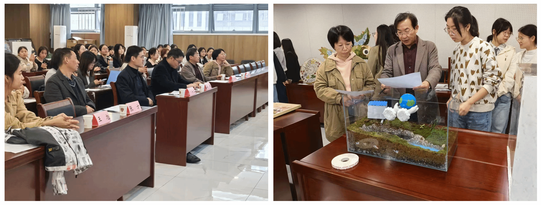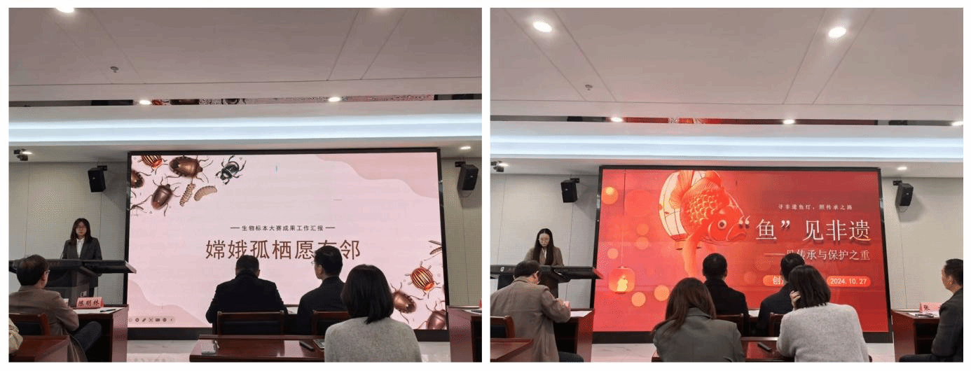 比赛分为动物组、植物组和创新创意组三个赛道,比赛过程包括标本展示、PPT展示和答辩环节。标本展示评审环节中,评委老师们认真评阅了每一件作品,对于作品中欠缺之处委婉点出,鼓励同学们精益求精,同时对作品中的亮点加以肯定。