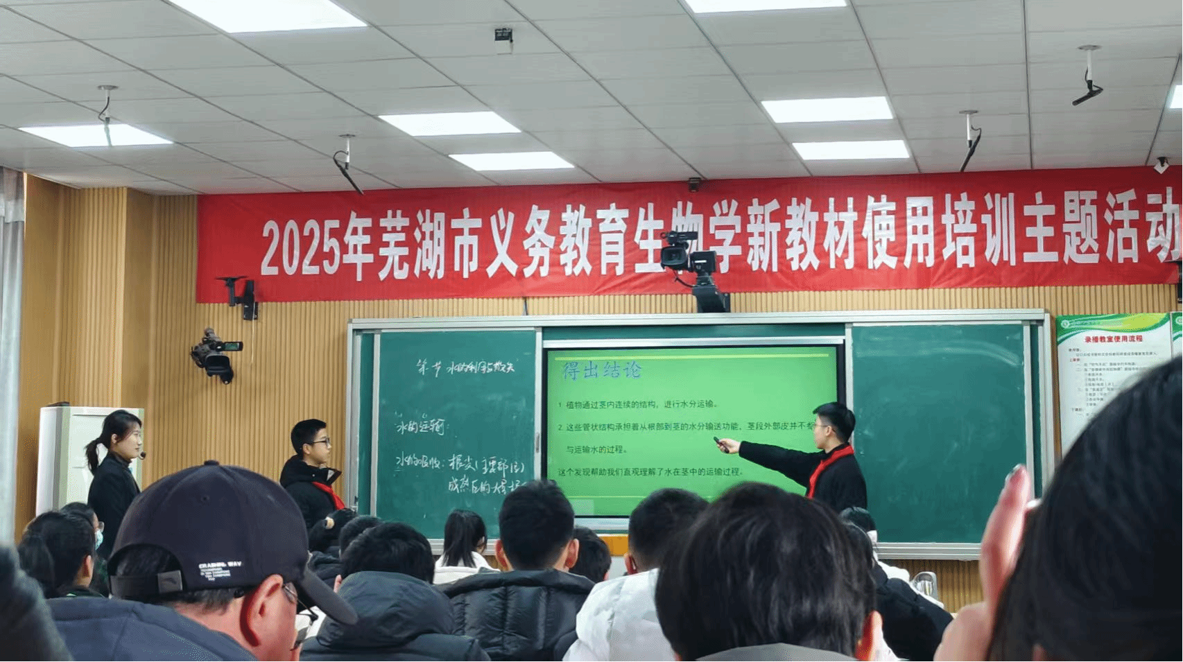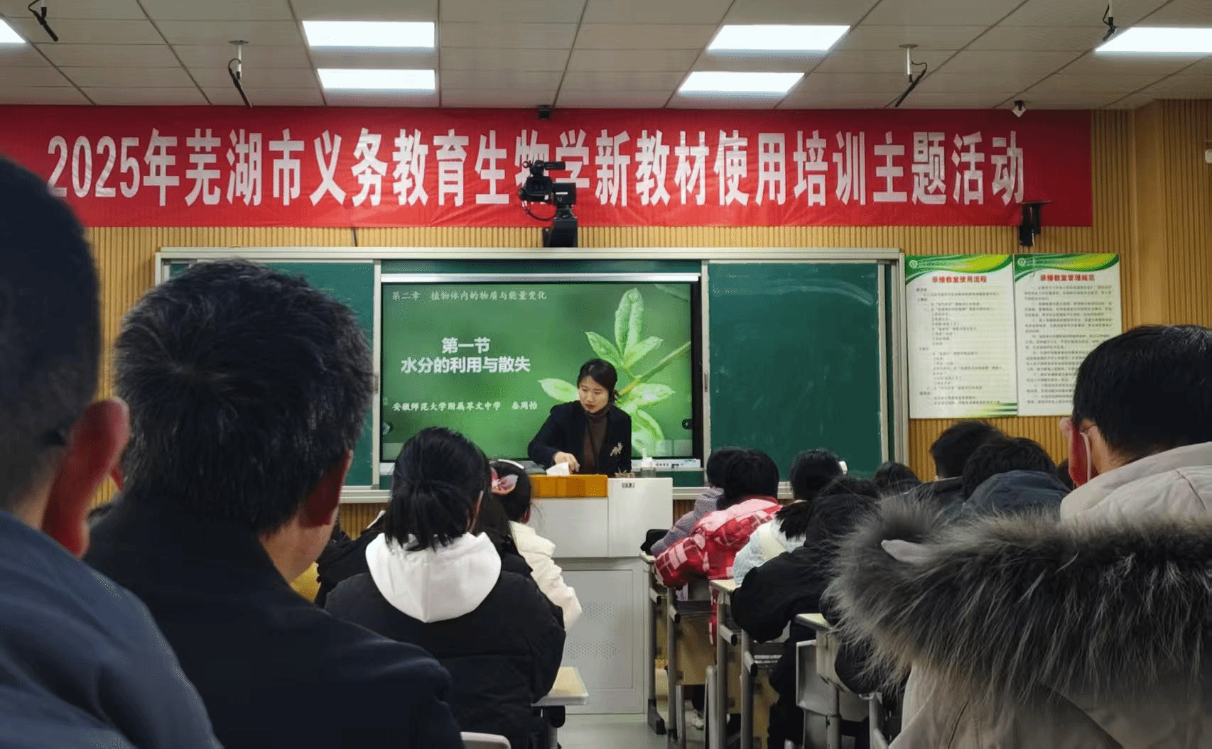 为深化生物学教学实践研究,助力师范生专业成长,3月6日下午,大二部分师范生在韩菲和李宁两位老师的带领下,参加了“2025年芜湖市义务教育生物学新教材使用培训”专题教研活动。本次活动在m88官方网站登录地址附属萃文中学举行,特邀人民教育出版社生物学教材编写专家王颖老师担任主讲。通过示范课展示与专题报告相结合的形式,王老师为生物师范专业大二员工呈现了一场理论与实践交融的学术盛宴。