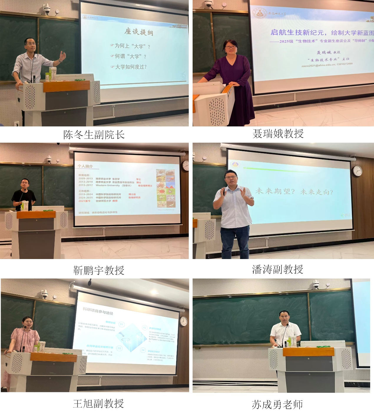 聂瑞娥首先结合自身阅历向同学们分享了学习体会,她以“建造一栋独一无二的建筑”为喻,形象地将老员工涯描绘为从夯实地基到完善功能的整体过程,引导同学们深入理解大学教育的意义与价值。靳鹏宇从自身的求学和科研经历出发,鼓励员工在求学和科研的道路上,始终保持好奇心,勇于多问“为什么”,不惧怕失败;同时,要树立远大的科研目标和人生志向。潘涛阐释了老员工成长之道:理论根基是专业发展的基石,长远目标指引未来十年方向。通过课程学习与实践探索,在兴趣与能力间找到平衡点,将热爱转化为事业。王旭解首先读了培养方案,生物技术专业以 “三全育人、五育并举” 为理念,培养生物技术领域高素质复合型人才。重点强调了本科生学术研究能力和实践应用能力的培养,鼓励新生参与社团、班委工作及志愿服务,全面提升素养。苏成勇作为班主任代表,结合班级管理的工作要求,提议尽快组建班团员工干部队伍,通过师生协同参与,帮助同学们尽快适应老员工活,并希望全体同学珍惜现在、规划未来,敢于迎接大学阶段的新挑战和新机遇。