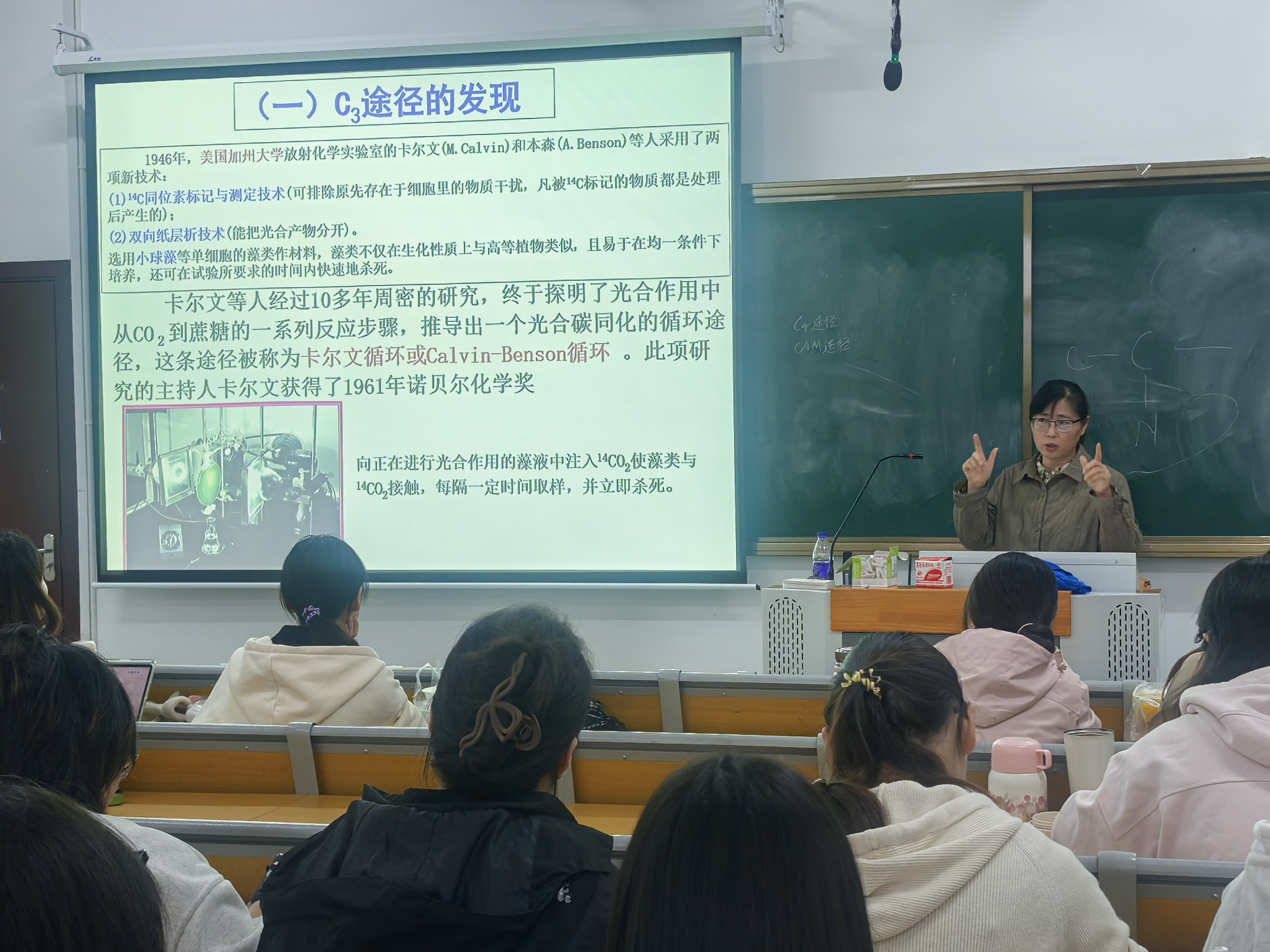 本次示范课围绕《植物生理学》课程中“植物光合作用-碳同化”内容展开教学。在新课导入环节,李君简要回顾了光合作用的光反应过程,并以农业生产中的粮食产量问题为切入点引入新课内容。授课过程中,她系统阐述了碳同化的基本概念与主要类型,重点讲解了C3途径的反应过程及调节机制,注重将理论学习与农业生产实践相结合,有效提升了员工的学习兴趣。教学中善于启发员工思维,通过课堂提问与练习引导员工积极思考,帮助他们准确理解碳反应过程。同时,适时引入我国在光合作用领域的最新科研论文,以前沿科研成果反哺教学,激发员工投身生命科学研究的热情。