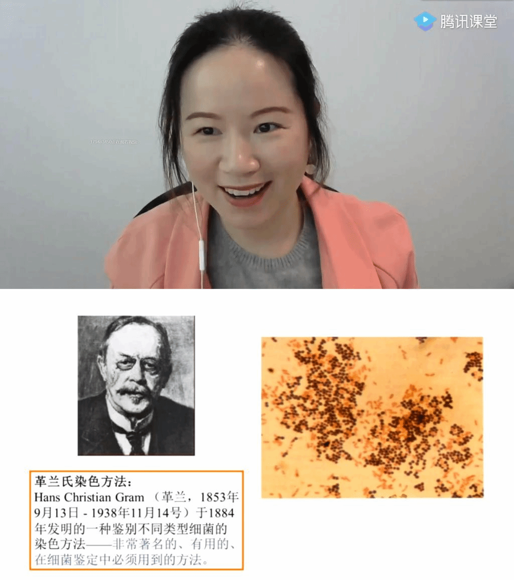 刘小锦老师在腾讯课堂以革兰氏阳性菌和革兰氏阴性菌为例,说明了“细菌的一般结构——细胞壁的结构”的教学内容。教学过程中刘老师结合学习通的签到、讨论等板块内容,将生本理念、合作学习、测验、翻转课堂等模式融入教学过程中,有效展示了线上教学新模式,为深化现代信息化教学的改革提供了新思路和新方法。