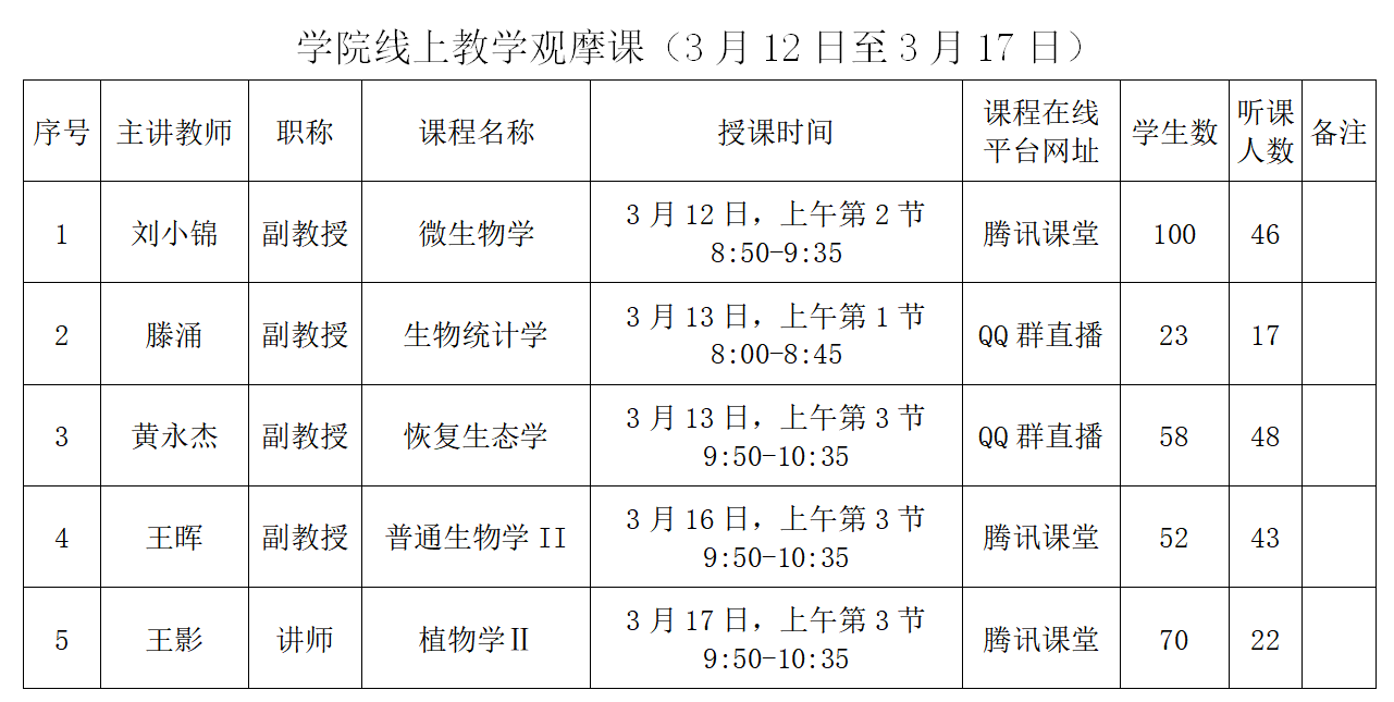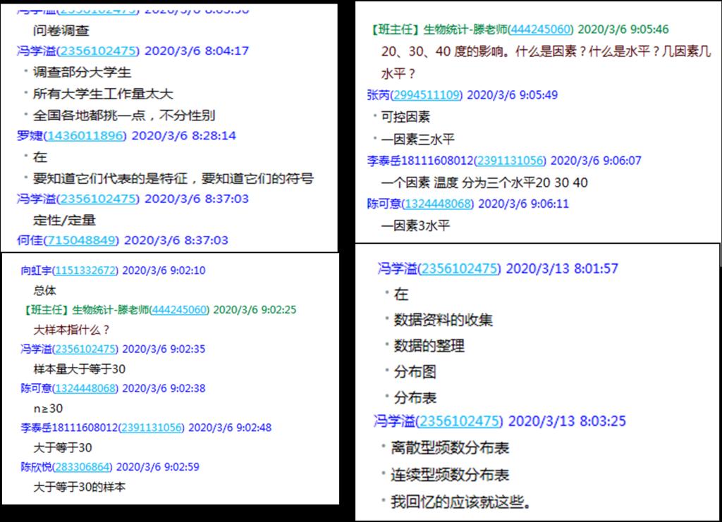 此外,在“超星学习通”的基础上,王影老师利用腾讯课堂进行了“裸子植物主要特征和生活史”的教学、滕涌老师和黄永杰利用QQ群的屏幕分享功能分别就《生物统计学》和《生态恢复》课程进行了生动活泼的线上课堂教学。