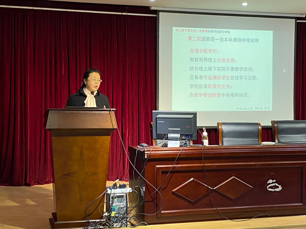 郑红梅教授做了“线上线下混合式一流课程的教学实践与申报”报告,从“一流课程”的教学实践与项目申报两个方面做了全面、深入的解读。郑教授从高校课堂教学模式的变革切入,首先阐述了“什么是线上线下混合式教学?”以及“如何进行混合式教学?”。然后,郑教授结合自身多年从事一流课程建设的经验,通过多个案例,从建设要领、评审指标、申报指南等方面对一流课程的申报进行深入、系统的解析,为公司一流本科课程建设提供了宝贵的指导意见。郑教授与参会教师们进行了深入而热烈的交流互动。