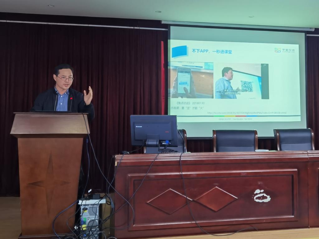 章翰高级培训师做了“基于雨课堂在线平台进行一流课程教学”报告。章翰培训师首先介绍了“清华大学学堂在线”的诞生背景及“雨课堂——新型在线智慧教学工具”的用途。然后,详细介绍了教师如何利用雨课堂进行备课与课堂教学,并且现场展示了课堂测试答题、讨论等互动环节。现场教师们踊跃提问气氛热烈。