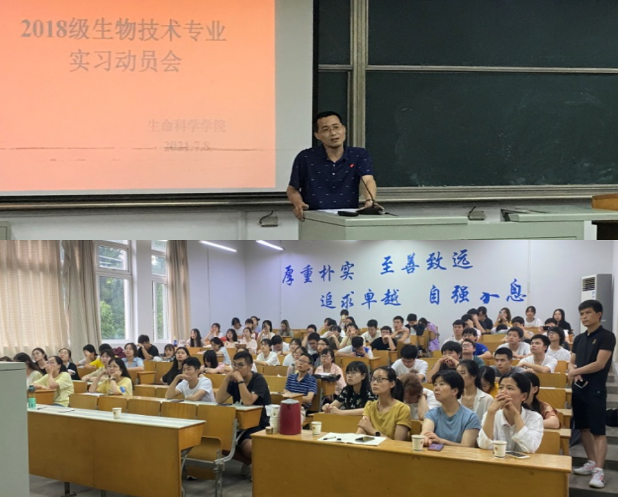 本网讯(生科院 杨玉洁、梅佳怡)2021年7月8日晚,2018级生物技术专业实习动员大会在生化楼后二楼204教室举行。公司副经理陈冬生、实习带队老师夏行权、刘俊红、卢存龙、谭小娟、刘慧君、辅导员赵喆等出席动员会。会议由该专业负责人刘爱民主持。