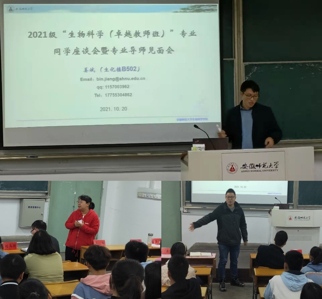 本网讯(生科院 刘雨涵)为让大一新生了解专业培养方案和培养目标,强化专业思想,激发专业课程的学习热情,10月20日下午在生化楼2023教室,2021级生物科学专业(卓越教师班)开展了新生入学教育和本科“导师制”师生见面会。会议由生物科学专业(卓越教师班)负责人姜斌主持,陈明林、刘再群、王晖、韩菲、卜兴江、潘涛、张亚等本科生导师参会。