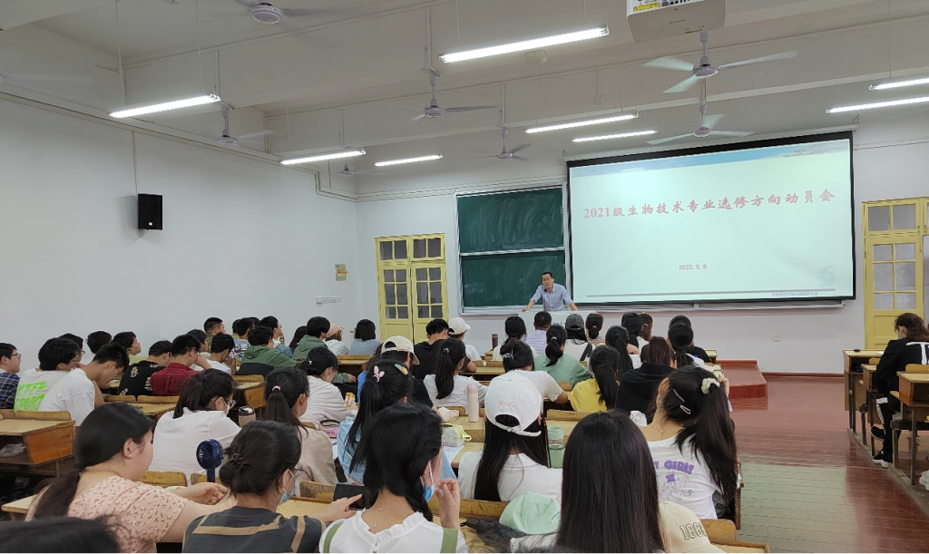 本网讯(生科院 周苏广羽)5月8日下午,m88官网在赭山校区教学楼1410教室举行了2021级生物技术专业召开专业选修方向辅导会,对专业培养方案选修课程给予解读,引导员工合理选择选修课程。本次会议邀请了生物技术专业两位负责人刘爱民(负责普通班)和王旭(负责拔尖班),以及专业选修方向课负责人张晓平(负责农业生物技术课程)、汪昌保(负责食品类课程)、陈冬生(负责生物制药类课程)等老师出席会议。会议由2021级生物技术3班副班长周苏广羽主持,2021级生物技术全体本科生参会。