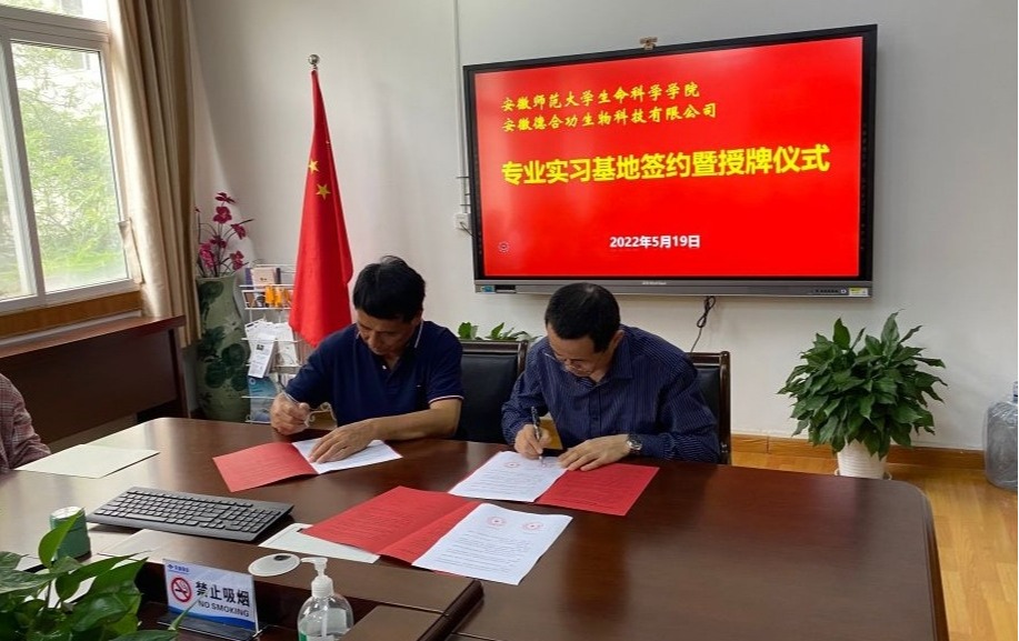 5月19日下午,安徽德合功生物科技有限公司董事长张权庚和总经理童永贵一行来到生科院,就专业实习基地、校企合作等事项进行洽谈,并签署了专业实习协议。签约仪式在赭山校区生化楼第一会议室举行,副书记汪倩倩、副经理陈冬生出席本次签约仪式。