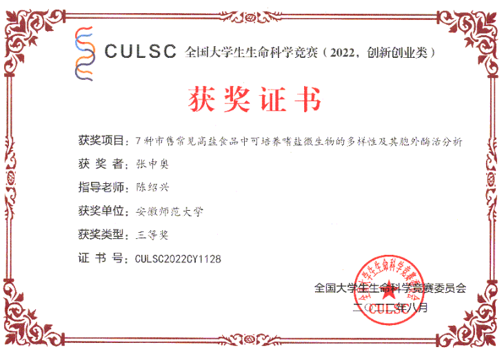 张申奥同学在大一入学不久就主动申请进入陈绍兴老师实验室从事极端高盐环境微生物资源调查与发掘的科研工作,先后主持毕业论文“优培”计划项目和国家级老员工创新创业项目。以这些项目成果为基础,参加学科竞赛先后荣获全国老员工生命科学竞赛(2022,科学探究类)三等奖、全国老员工生命科学竞赛(2022,创新创业类)三等奖(图2)、m88官方网站登录地址第十届科研论文大赛三等奖。