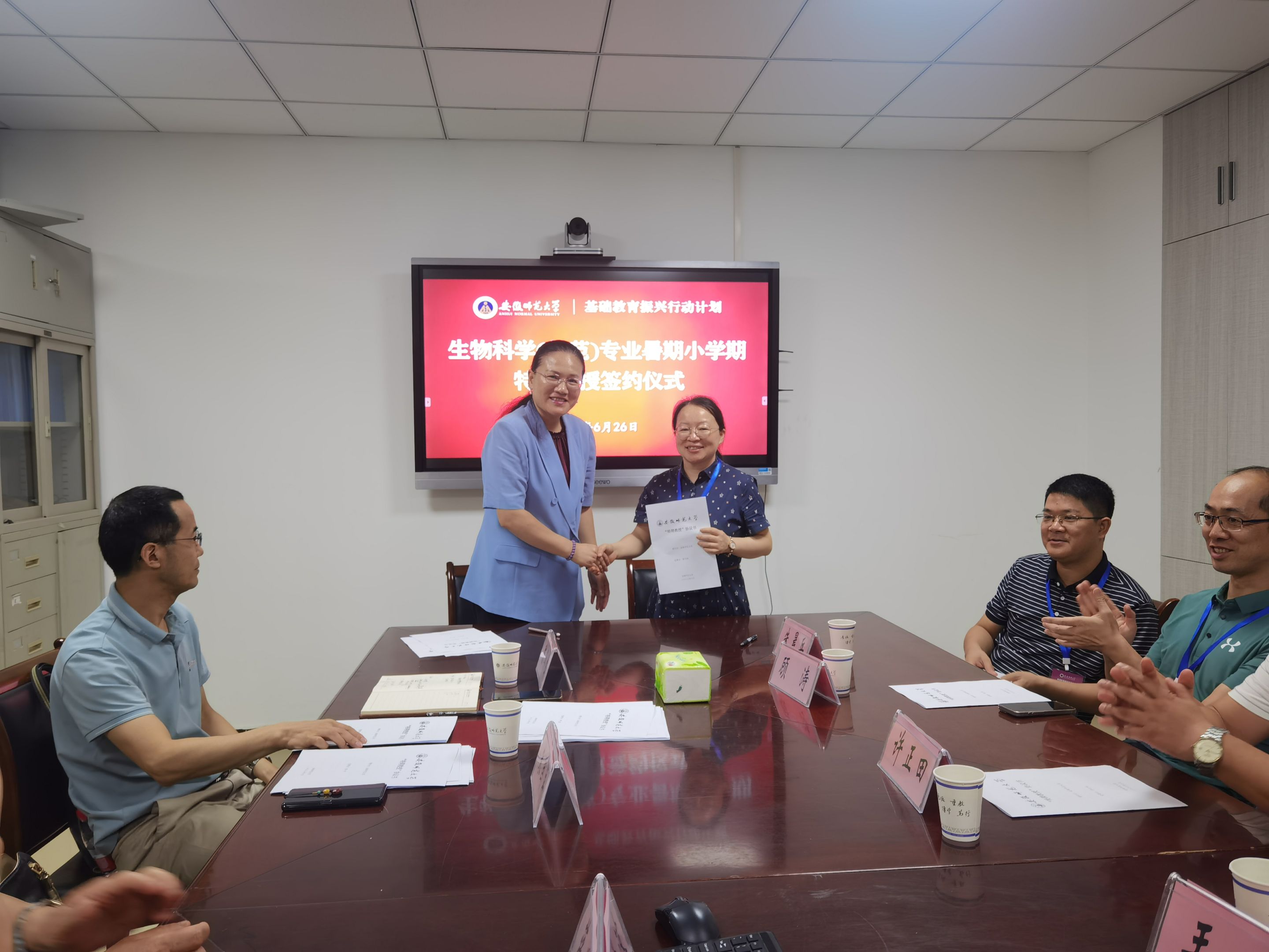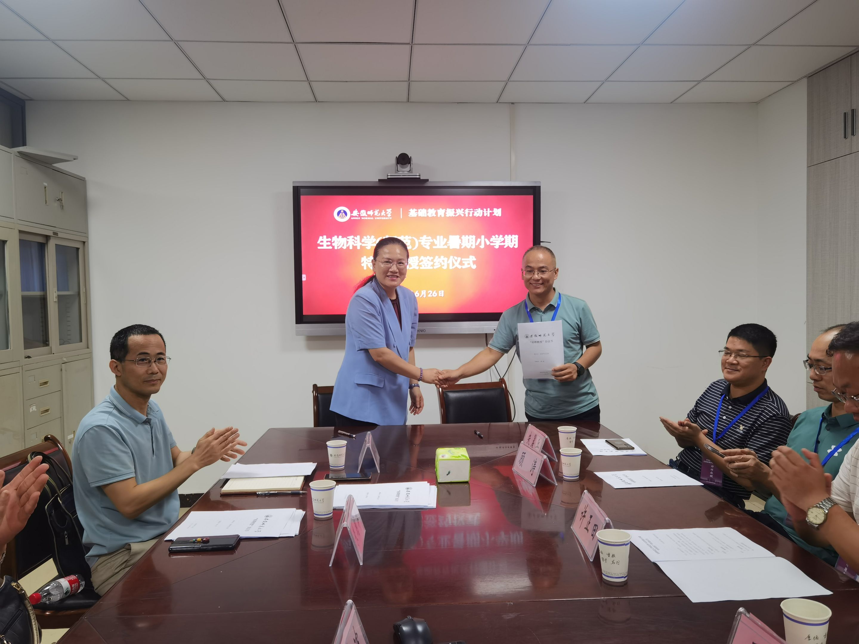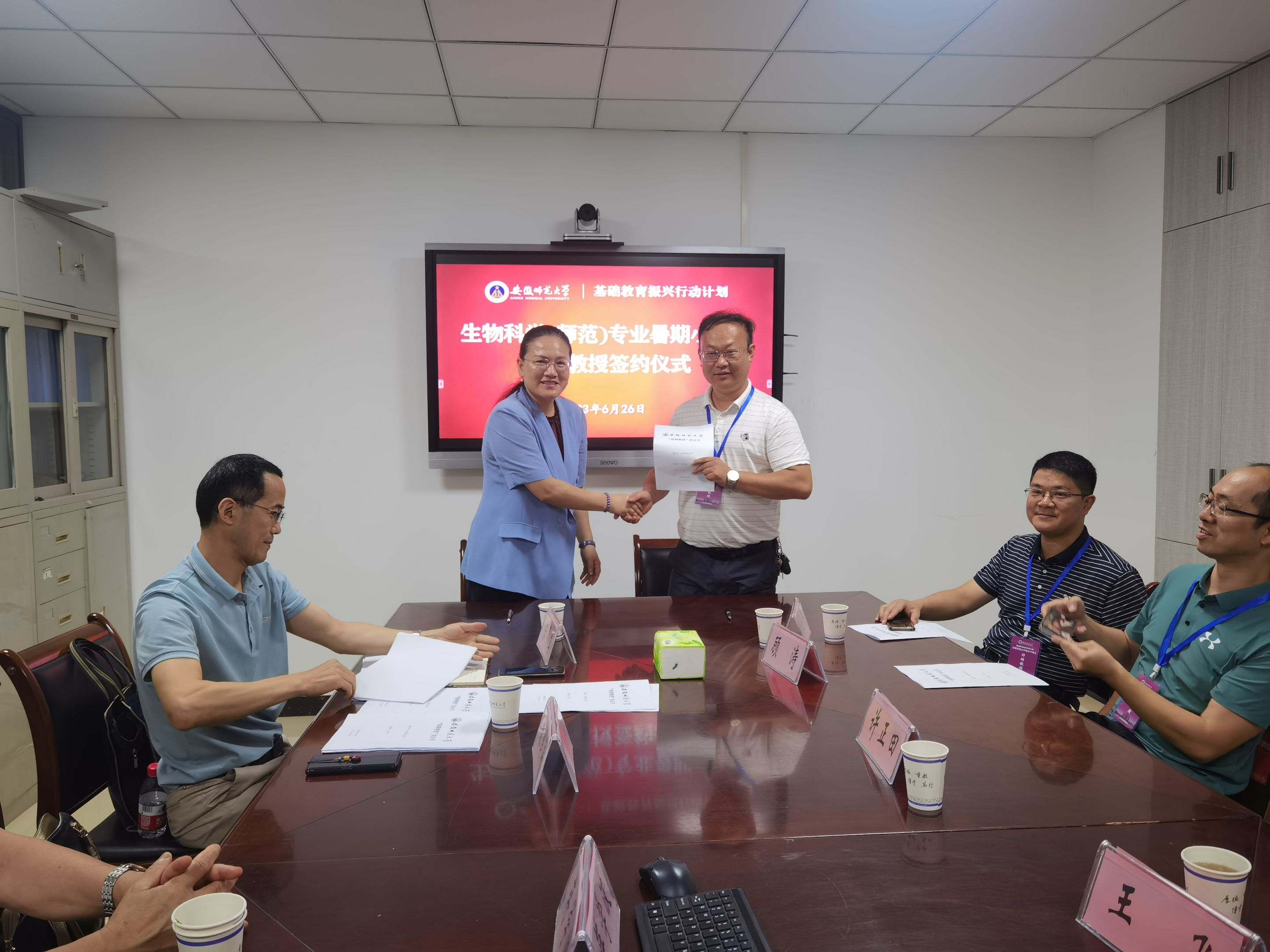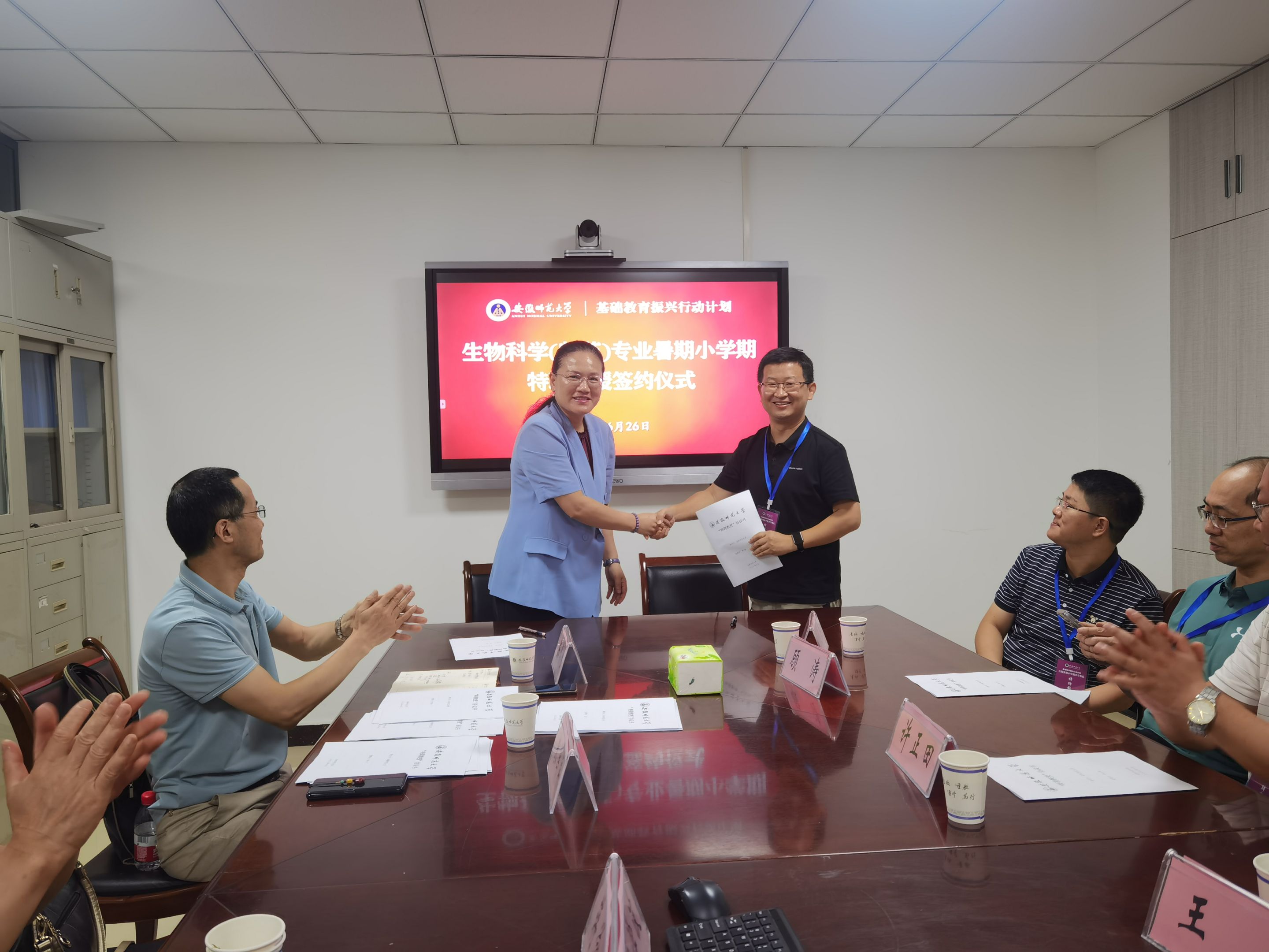 集团暑期小学期开学典礼暨特聘教授聘任仪式结束后,生命科学公司在花津校区文典楼315举行生物学科暑期小学期特聘教授签约仪式,公司党委书记蒋学波、经理朱国萍、副书记汪倩倩、副经理陈冬生及生物科学(师范)专业负责人杨安娜出席签约仪式。