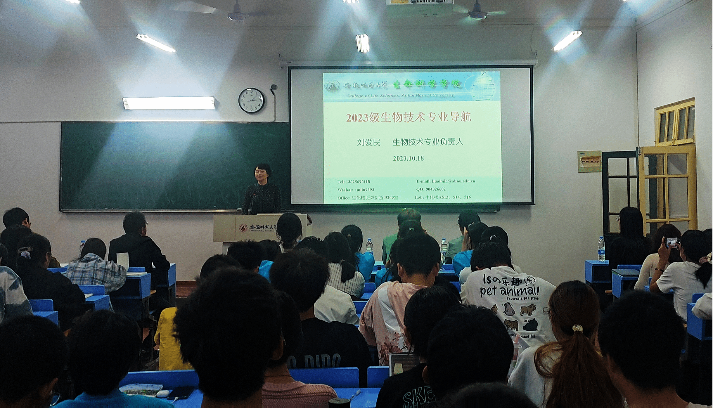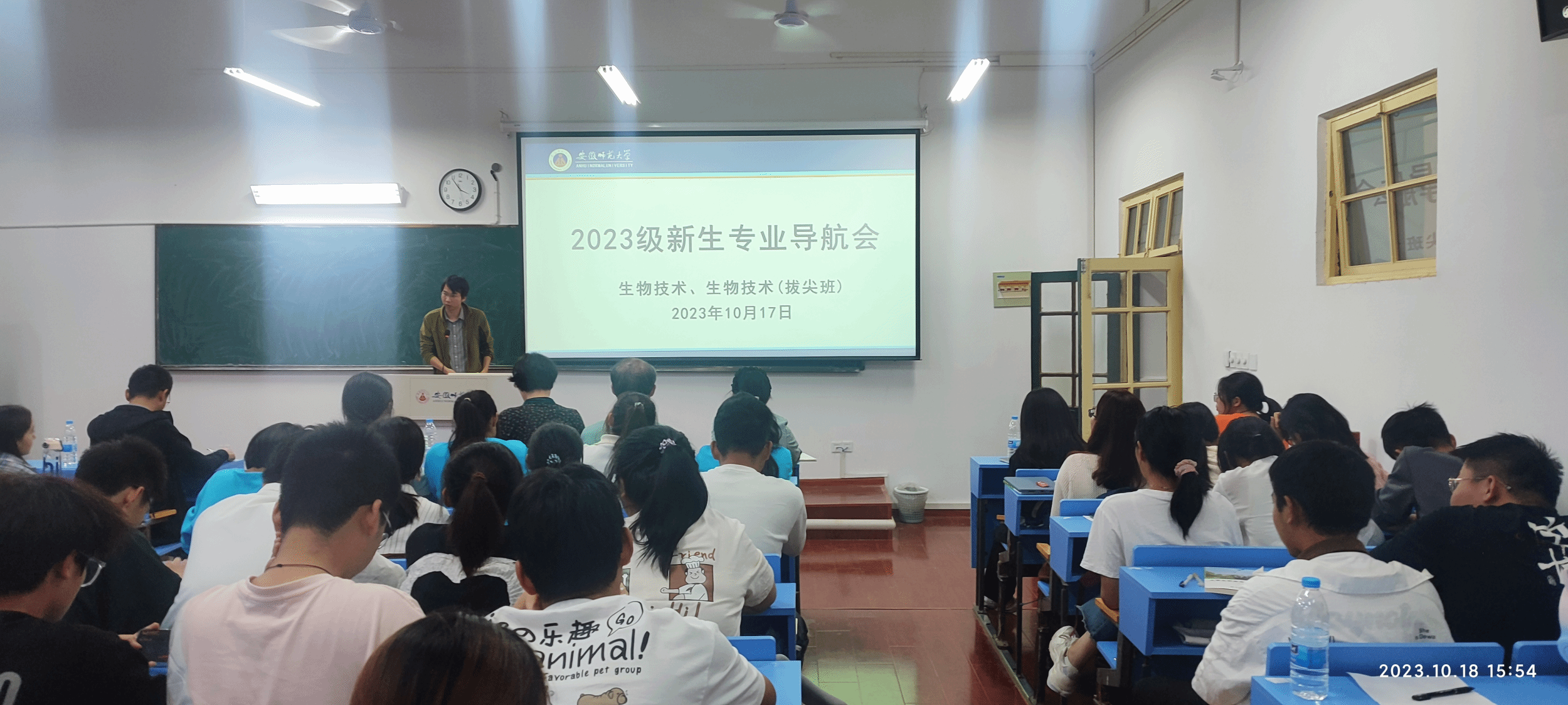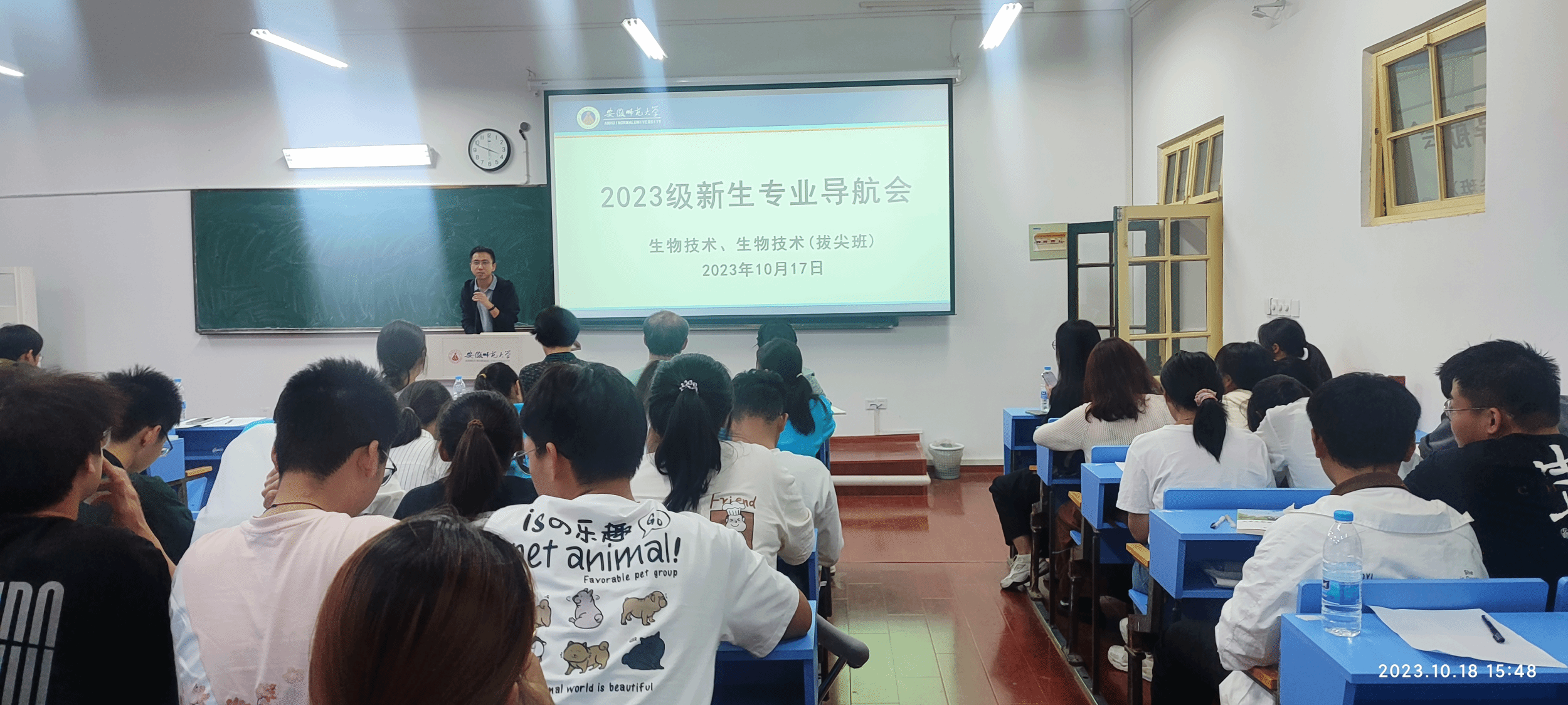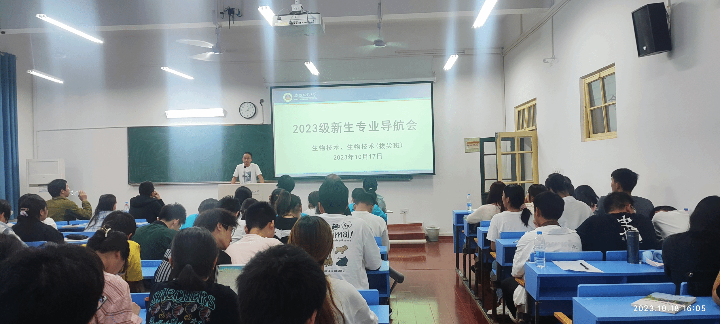 本网讯(生科院 赵航 刘梦婷)10月18日下午,生科院在教学楼1203教室召开了2023级生物技术新生专业导航会。公司教学副经理陈冬生,生物技术专业负责人刘爱民,生物技术拔尖班负责人王旭,教师代表许岳慷、刘必融、朱晨、袁良兵、左胜老师,辅导员刘梦婷、赵航以及2023级生物技术和生物技术拔尖班专业全体新生参加会议,会议由刘梦婷主持。