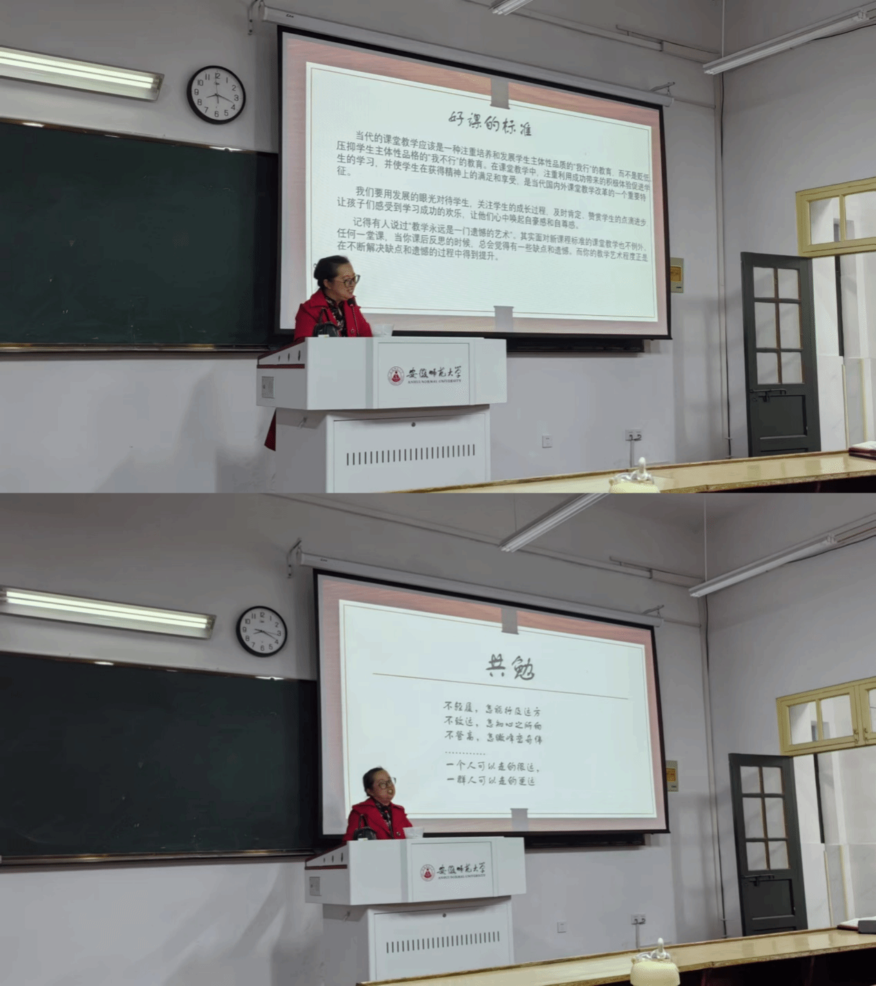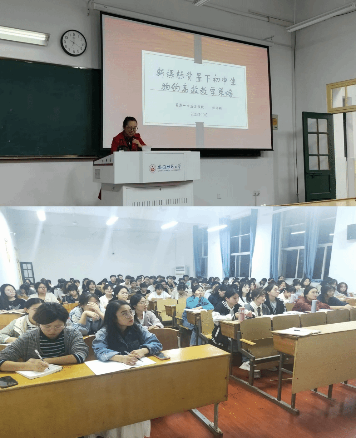 本网讯(生科院 王灿虹 姜斌)10月30日晚,生物科学(师范)专业卓越教师班于教学楼1403教室开展一线中学教师教学经验讲座。21、22、23级生物科学卓越教师班全体同学参会,会议邀请芜湖一中教育集团延安公司高级教师沈丽丽老师主讲,生科卓越班负责人姜斌老师主持,公司汤菊老师和李宁老师参会。