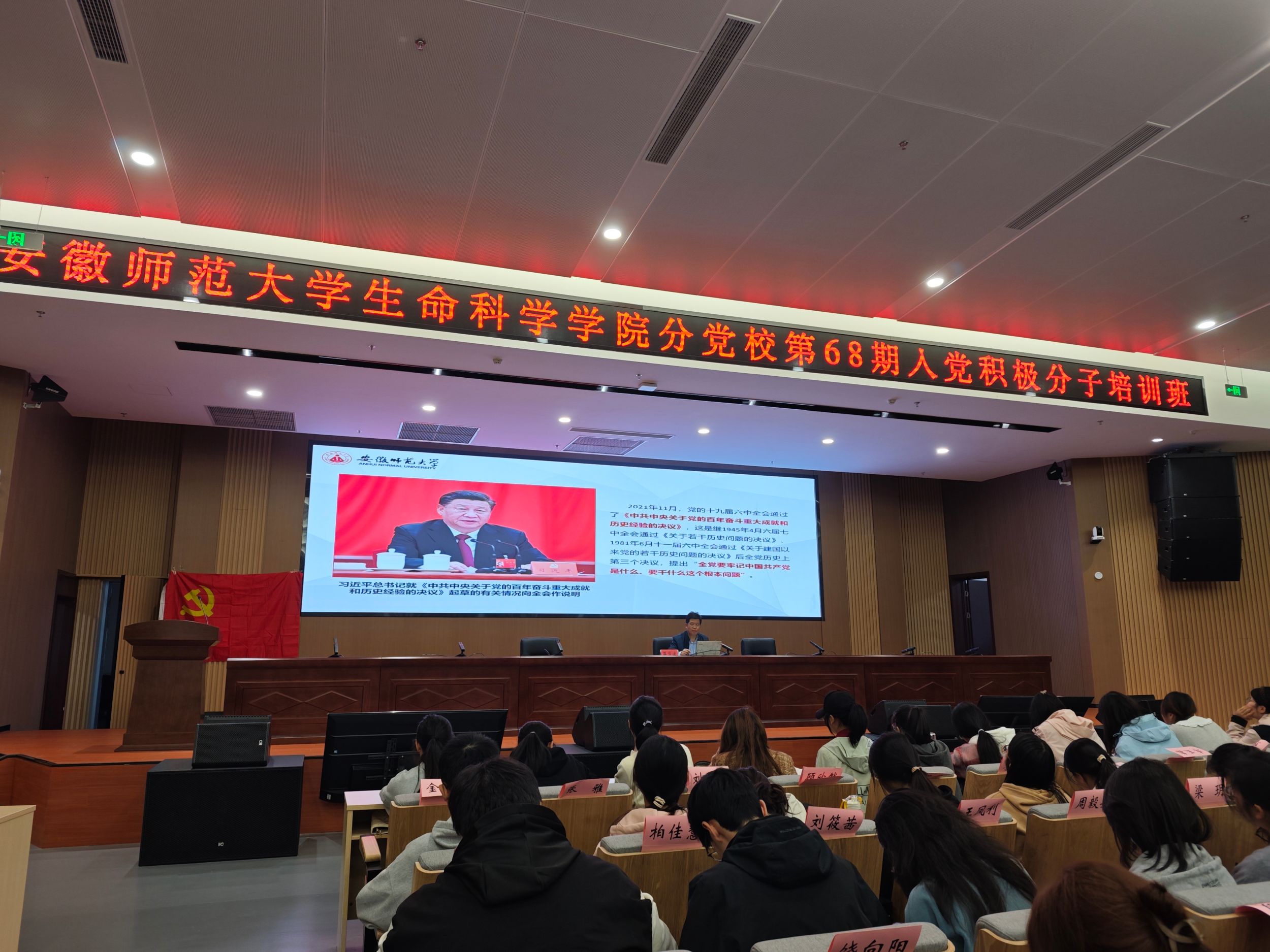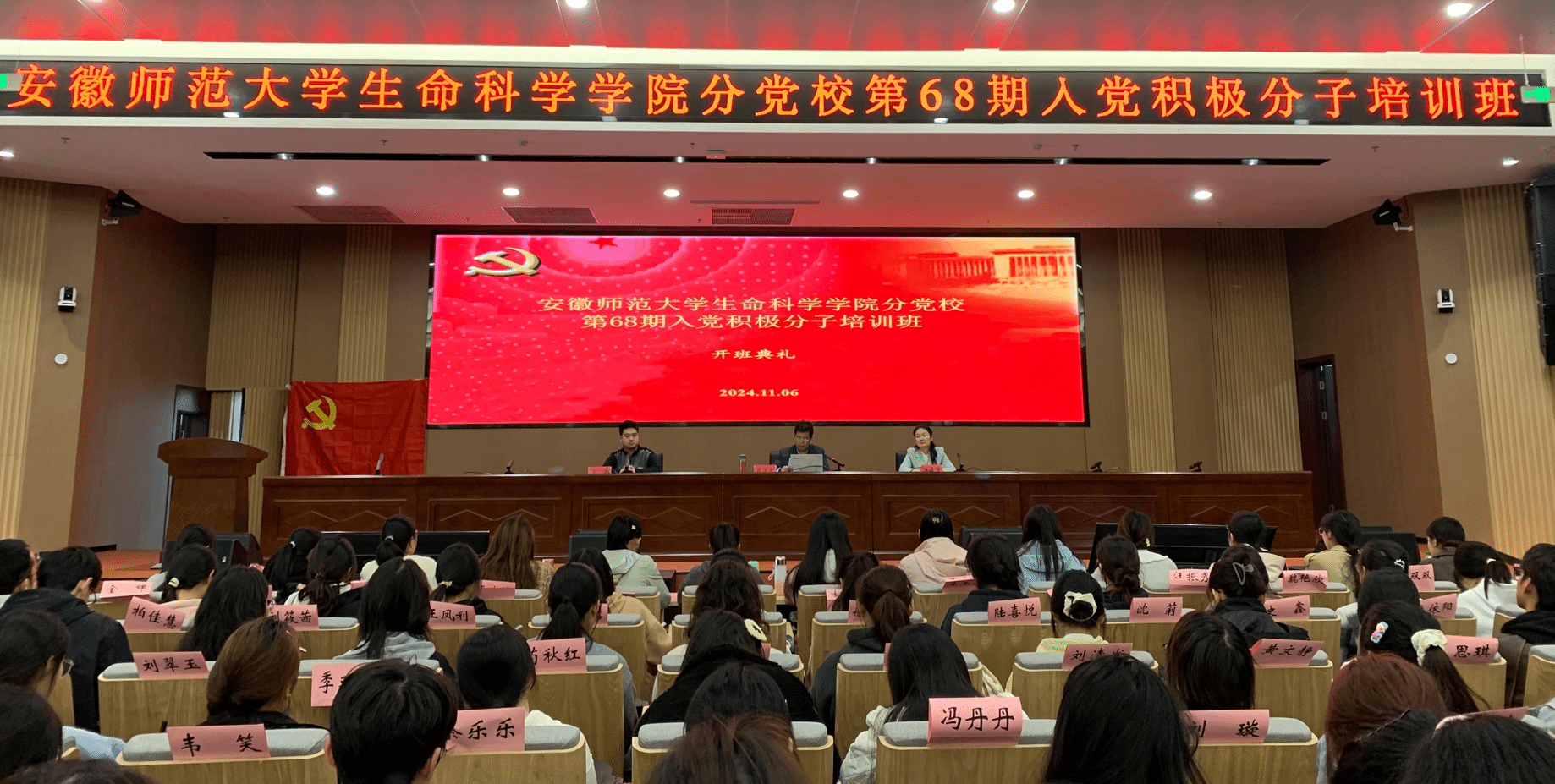 (本网讯 生科院)为进一步做好入党积极分子培养教育工作,11月6日下午,生科院分党校第68期入党积极分子培训班开班典礼在文典楼报告厅举行。公司党委书记蒋学波、党委副书记汪倩倩、公司组织员兼党委秘书汪诚及此次培训班全体学员参加了此次开班典礼。