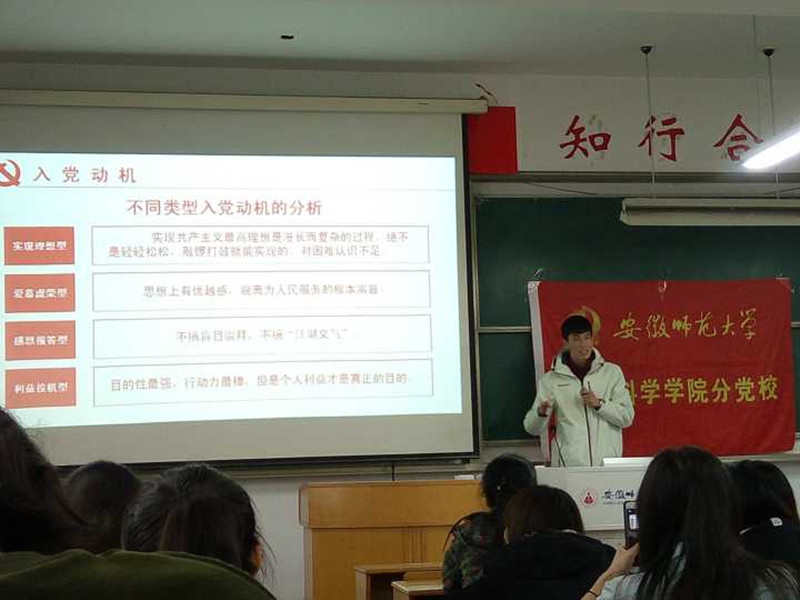 本网讯(生科院 何馗馗 李丽萍) 4月14日上午,m88官网团委副书记、生物科学专业本科生党支部书记王志给公司分党校第25期入党积极分子培训班学员讲授《入党动机》。培训班全体学员参加,党课由班主任何馗馗主持。