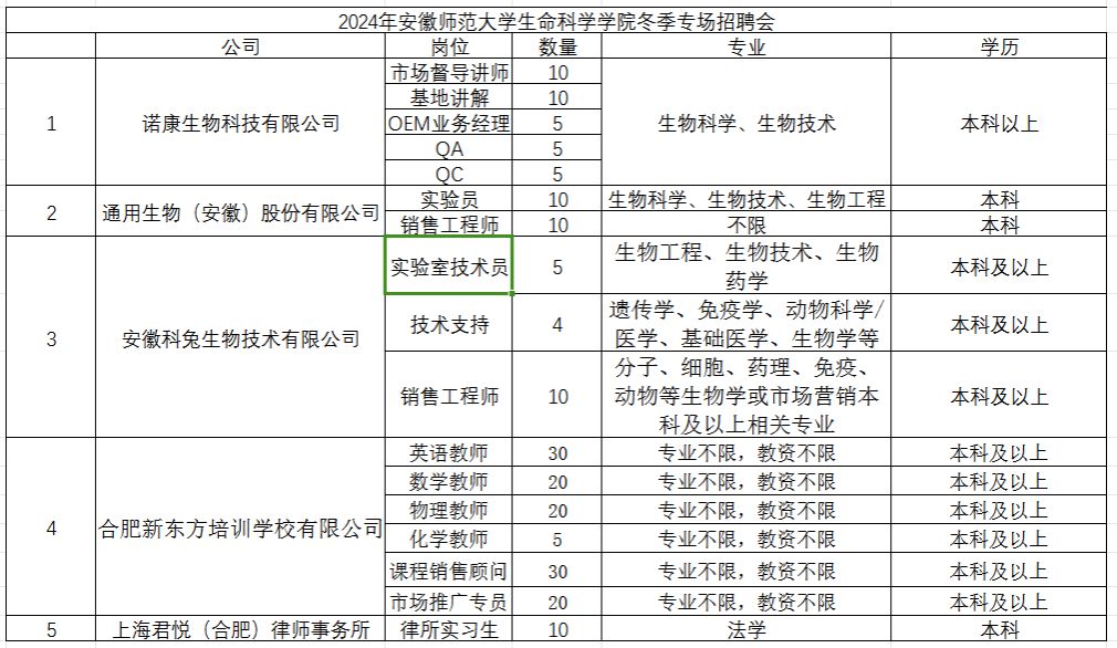 2024年安徽师范老员工命科学公司冬季专场招聘会