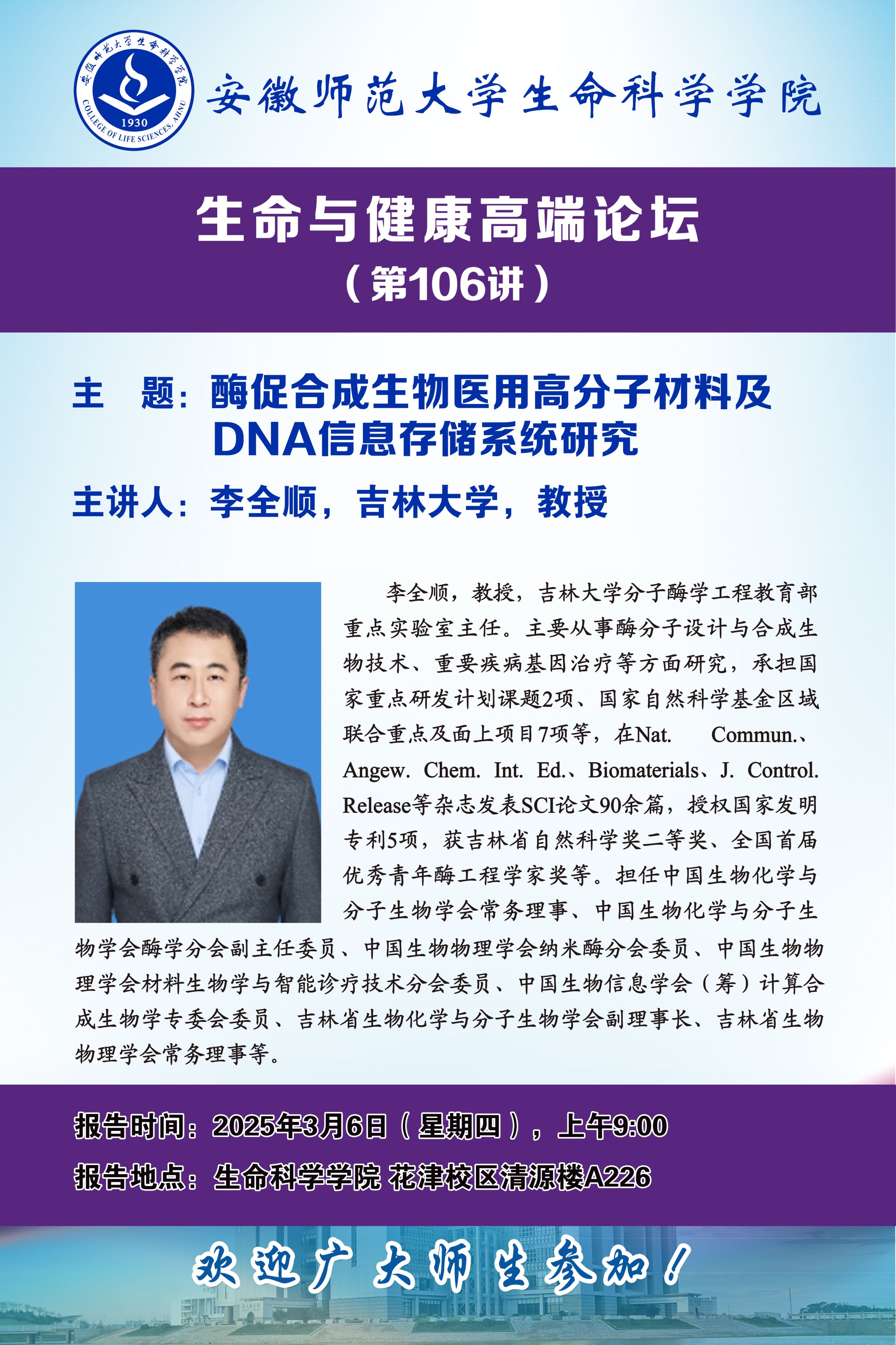 【学术预告】生命与健康高端论坛第106讲:酶促合成生物医用高分子材料及DNA信息存储系统研究