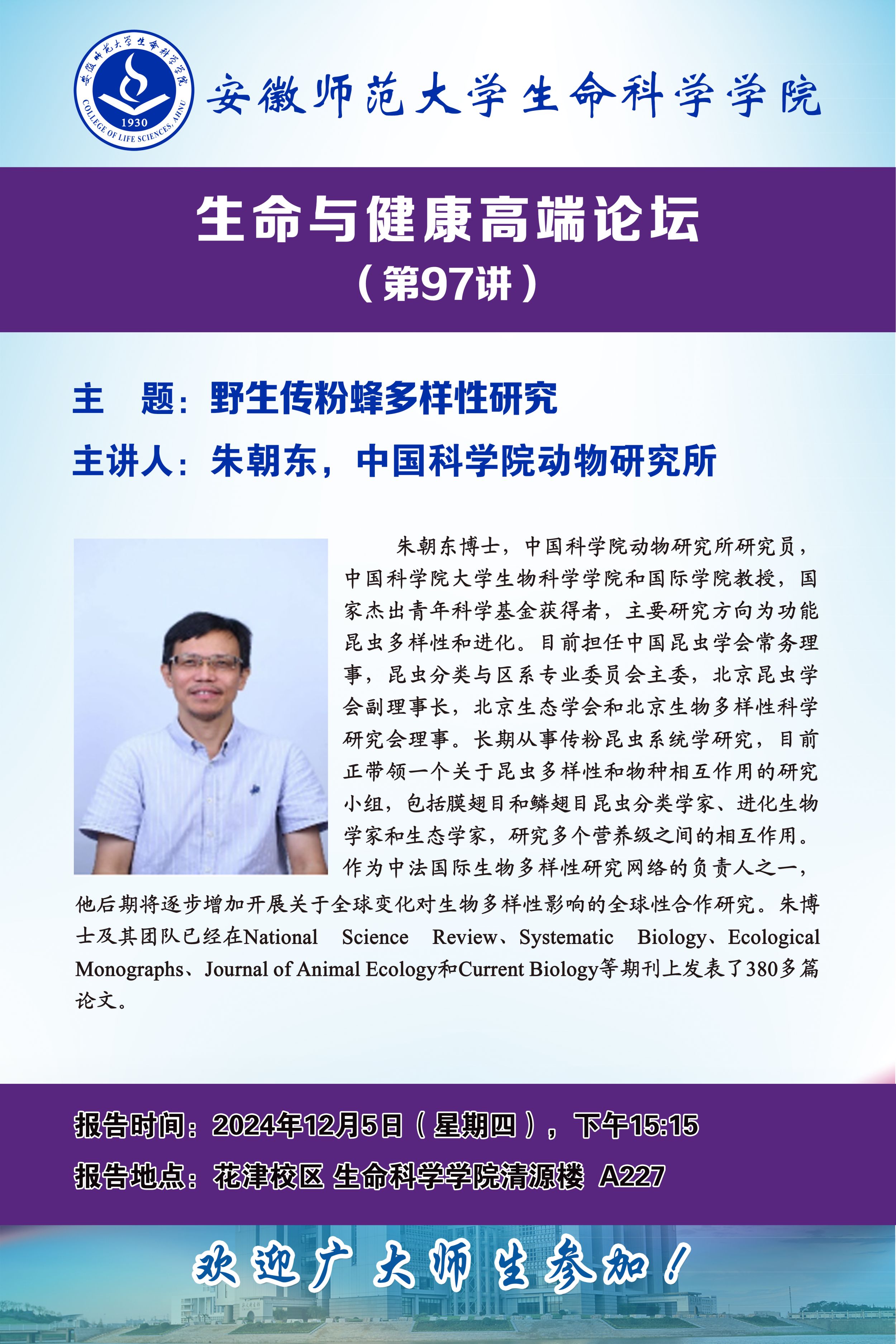 上一篇:【学术预告】生命与健康高端论坛第98讲:东方蜜蜂的遗传多样性和保护
