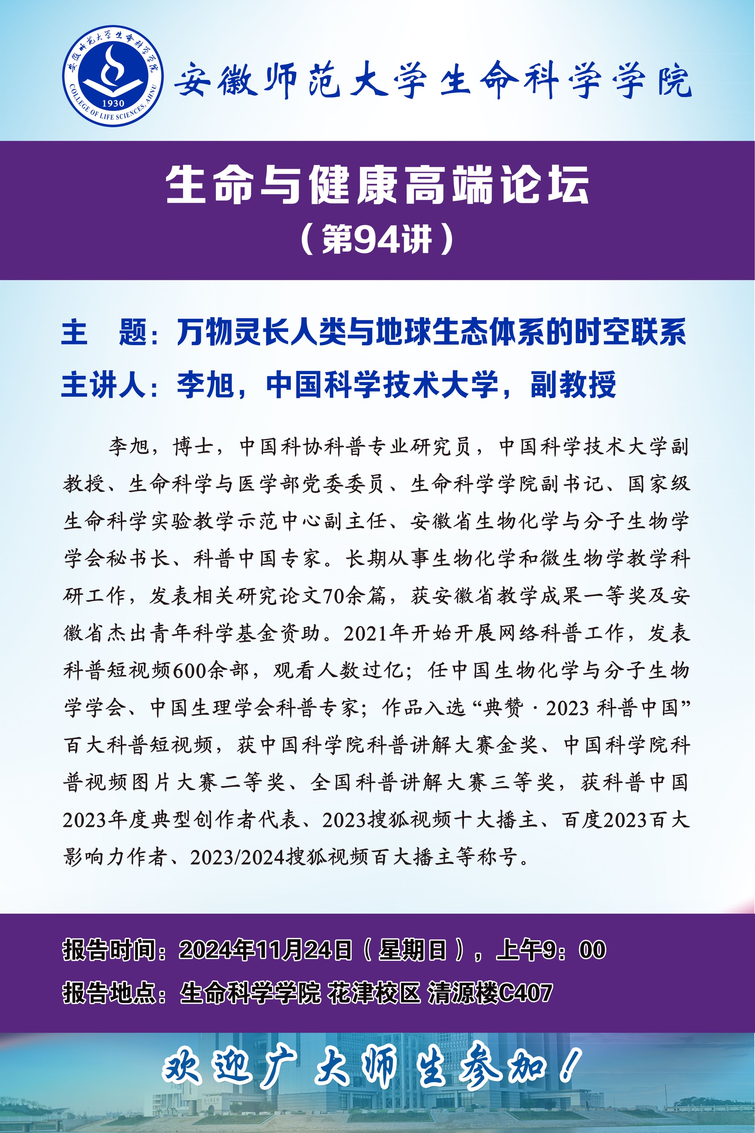 【学术预告】生命与健康高端论坛第94讲:万物灵长人类与地球生态体系的时空联系
